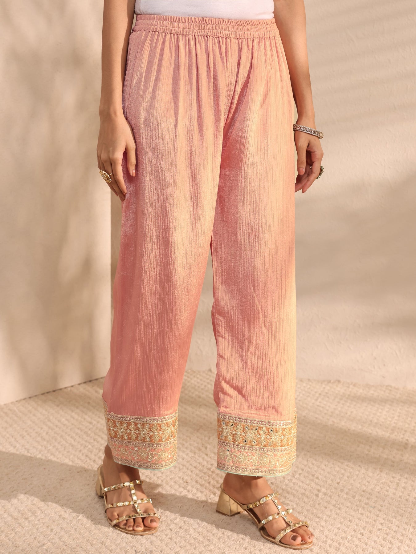 Our 3-piece peach chinon Anarkali Kurta Set features a round neck neckline, regular sleeves, and a statement yoke. Complemented with lining and flared palazzo pants with a partially elasticated waistband, and an embroidered dupatta. Adorned with intricate thread and sequin embroidery, this style is perfect for festive occasions.