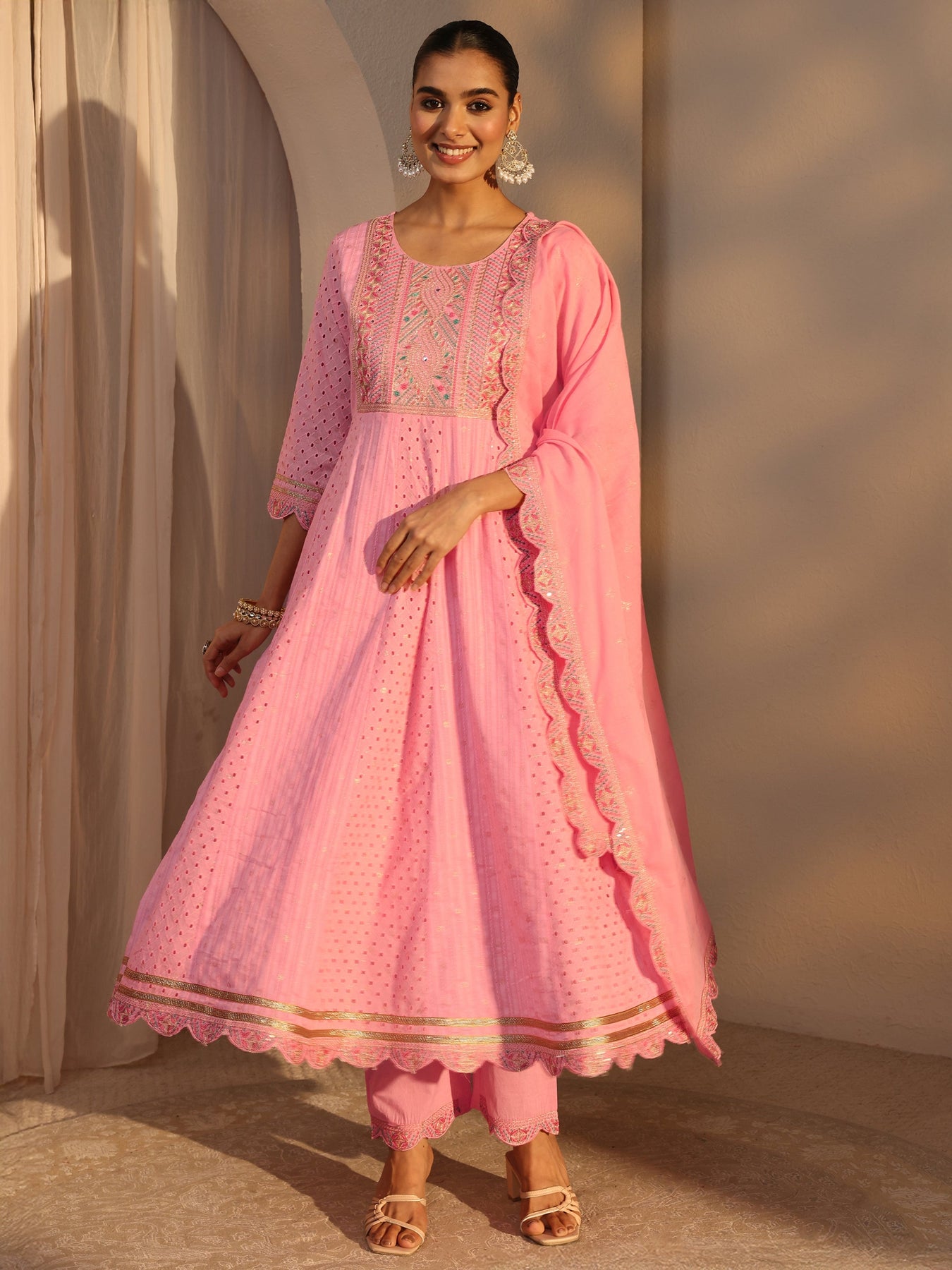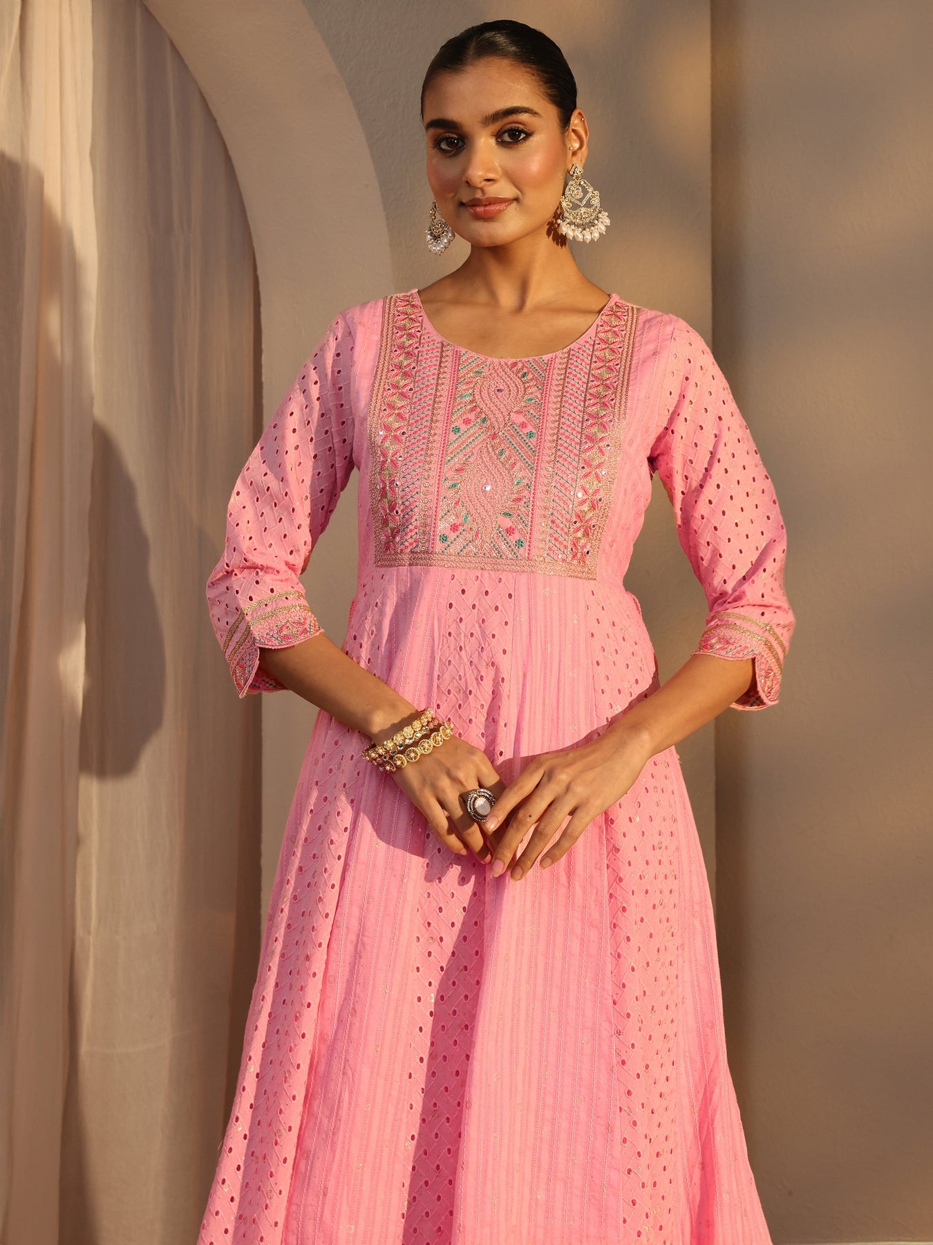 Pink Schiffli Embroidered Cotton Anarkali Suits Set With Dupatta