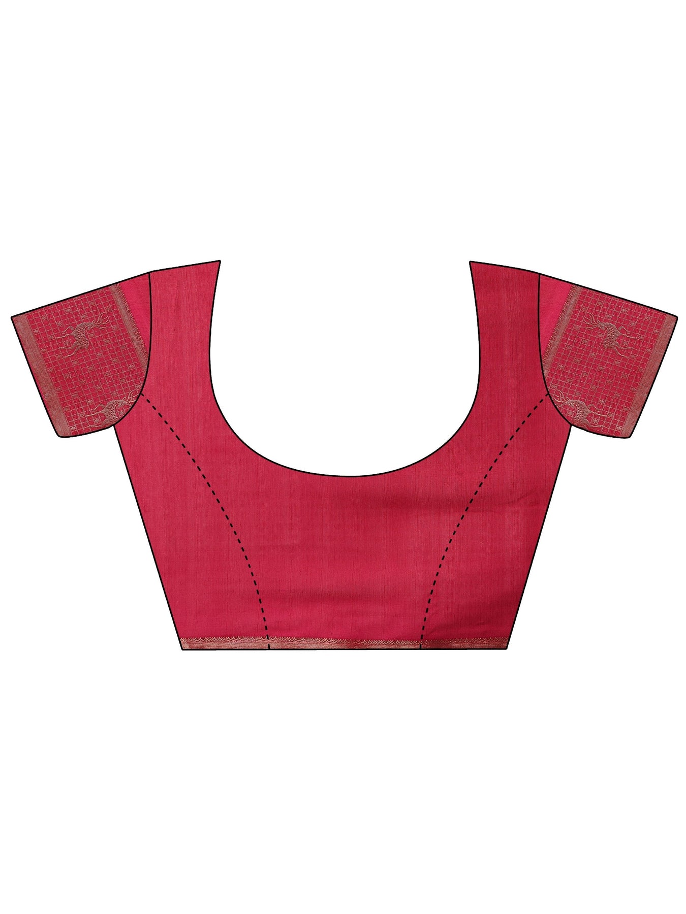 Our fuchsia printed silk blend saree features captivating Ethnic Motif pattern. Complemented with a blouse piece. This charming saree is perfect for festive occasions.