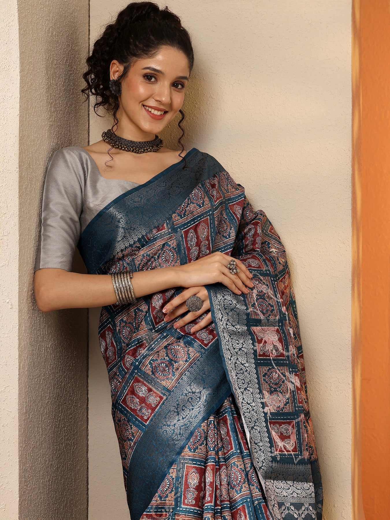 Blue Printed Silk Blend Saree With Unstitched Blouse Piece