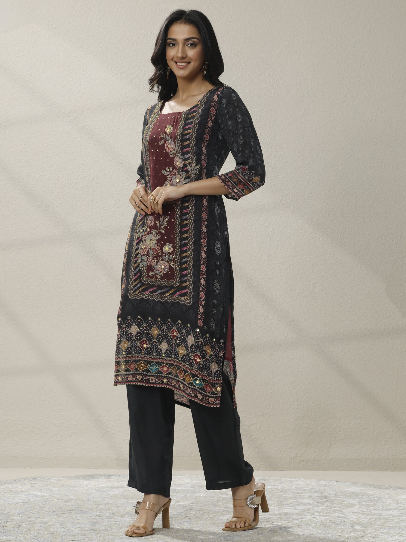 Our 3-piece Black and Maroon Muslin Straight-Fit Kurta Set features a Round Neckline, Regular Sleeves, and statement Yoke. Complemented with Straight Pants with a Partially Elasticated waistband and 2 pockets, and a Printed dupatta. Adorned with floral printed, this style is perfect for Dark Festive.