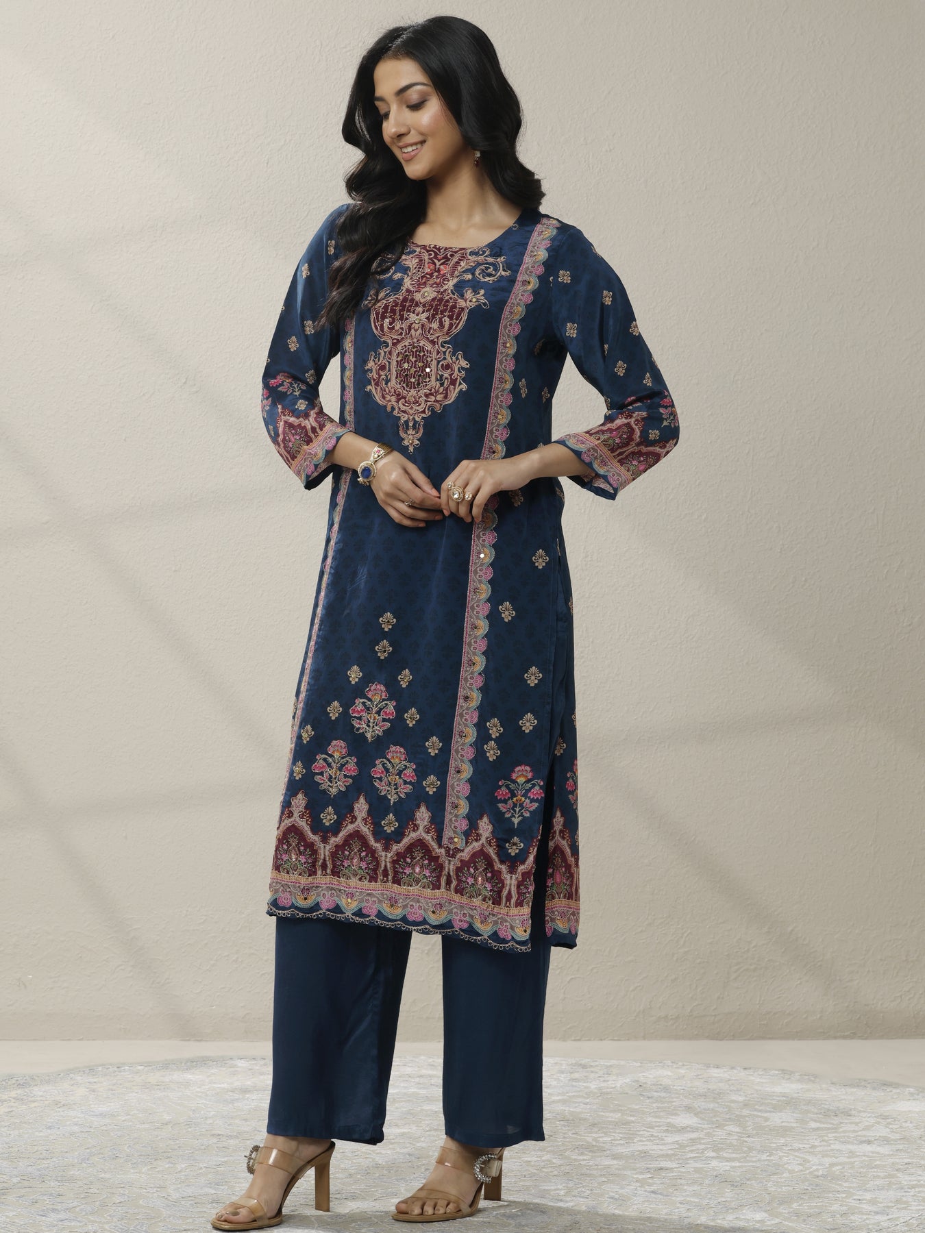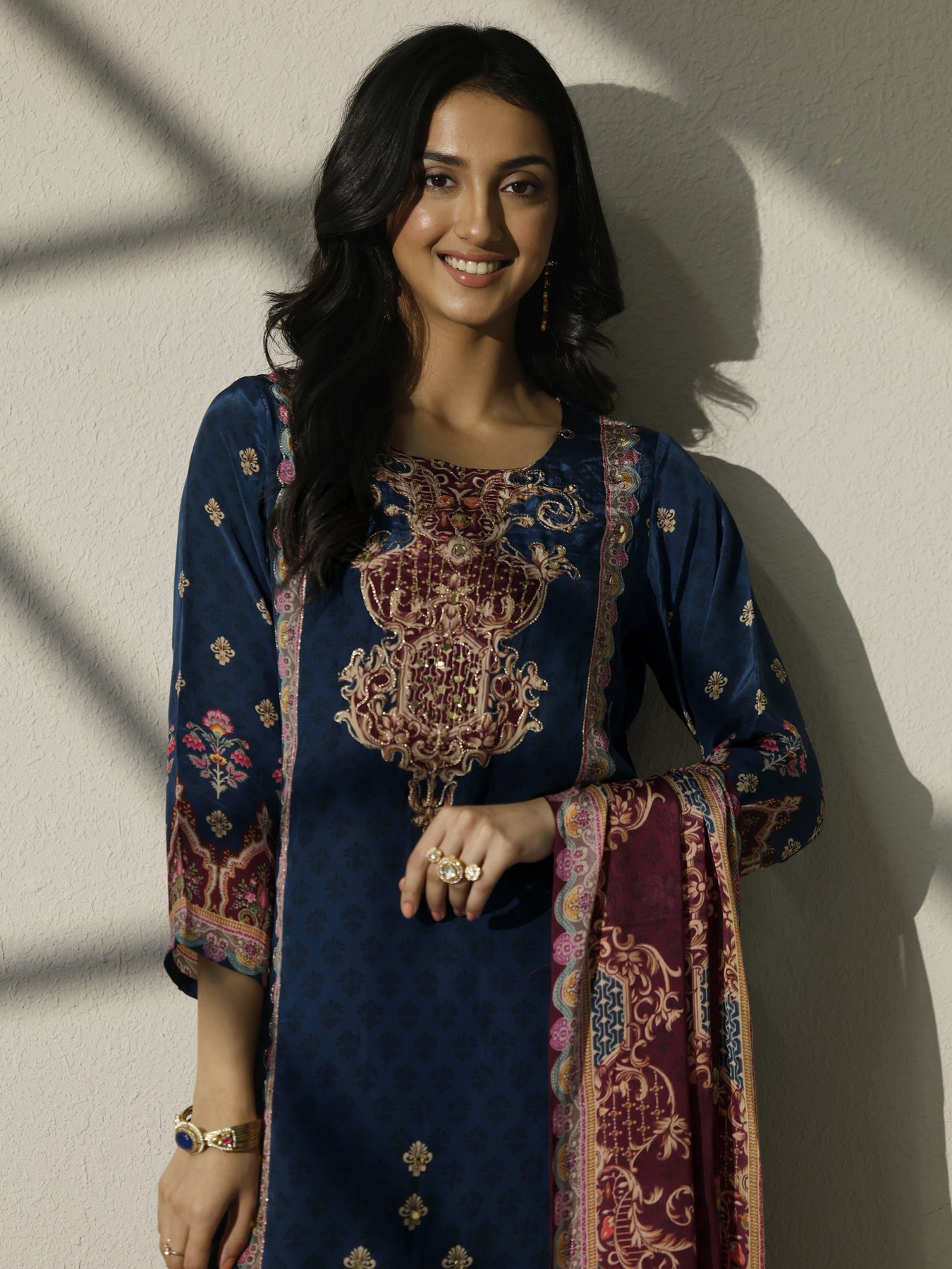 Our 3-piece Navy Blue Muslin Kurta Set features a Straight-fit kurta with a Round Neckline, Regular Sleeves, and statement yoke. Complemented with Straight Pants with a Partially Elasticated waistband and 2 pockets, and an printed dupatta. Adorned with ethnic motif printed, this style is perfect for Dark Festive.