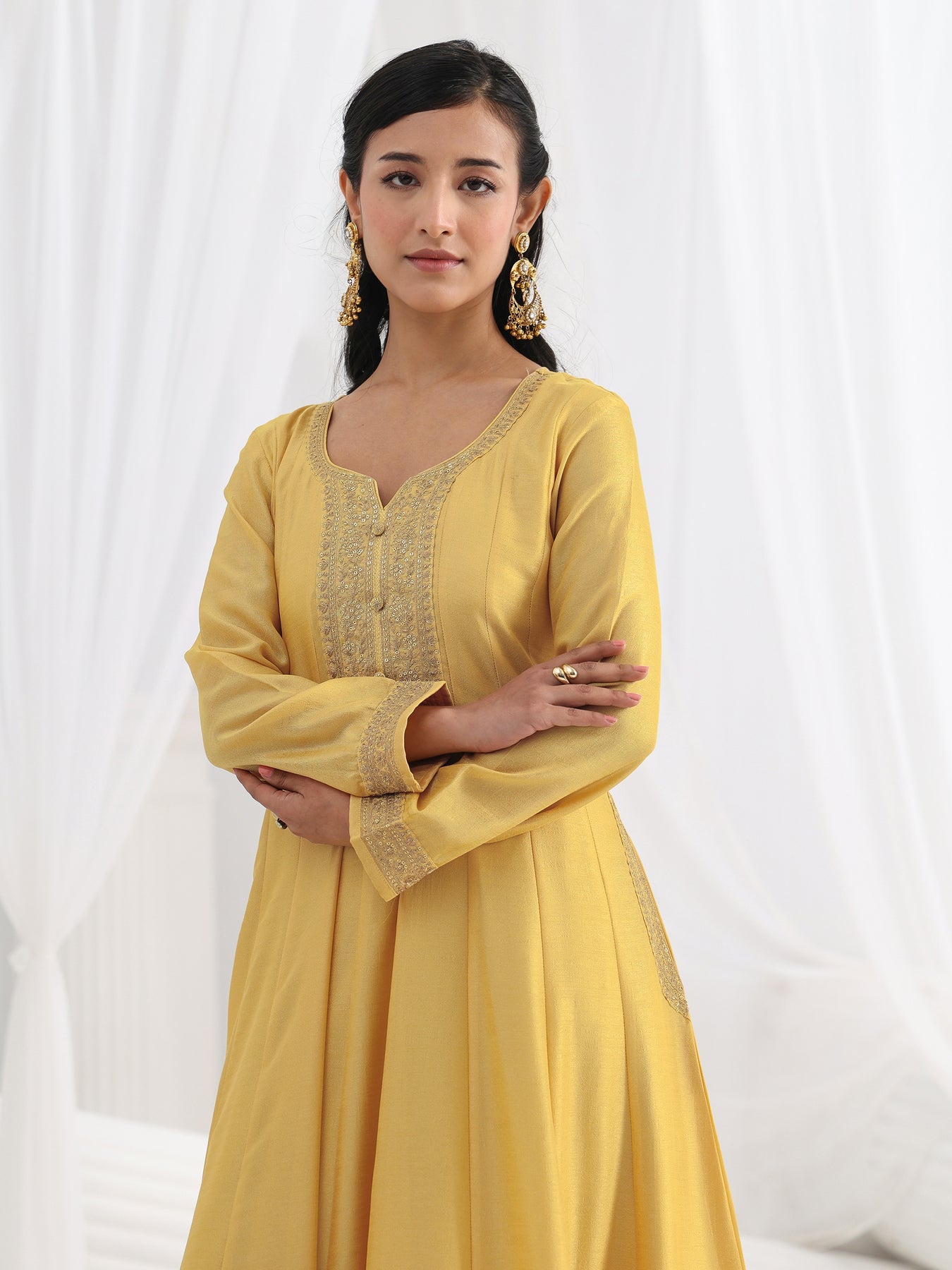 Yellow Embroidered Silk A-Line Gown With Dupatta