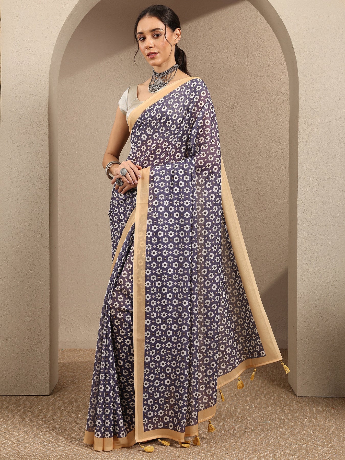 Our Navy Blue printed Georgette saree features captivating floral print. Complemented with a Unstitched blouse piece.. This charming saree is perfect for festive occasions.