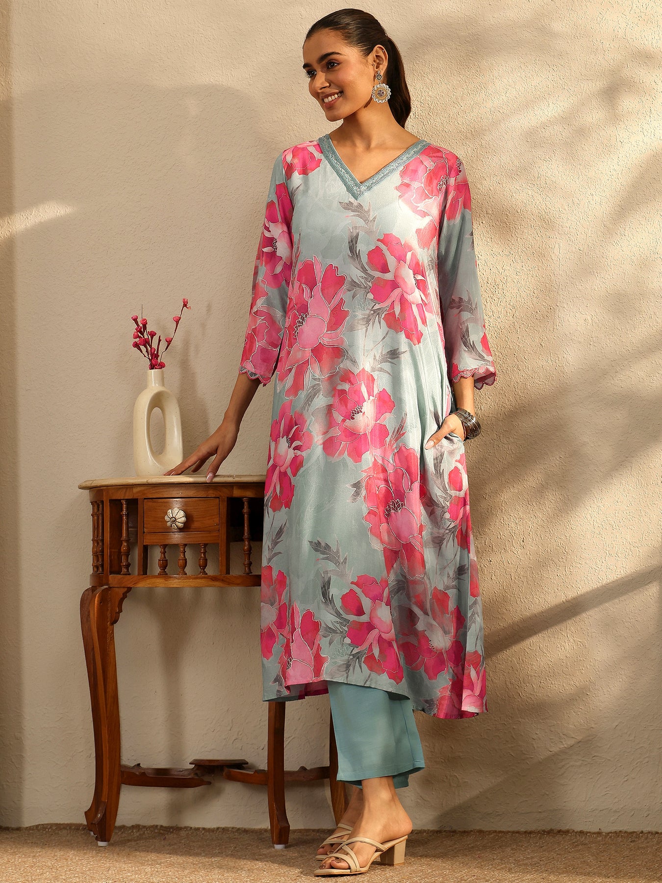 Our 2-piece pink and blue muslin a-line set features a V-neckline, regular sleeves, and a statement yoke. Complemented with straight pants with a partially elasticated waistband. Adorned with floral printed, this style is perfect for work wear and casual wear.