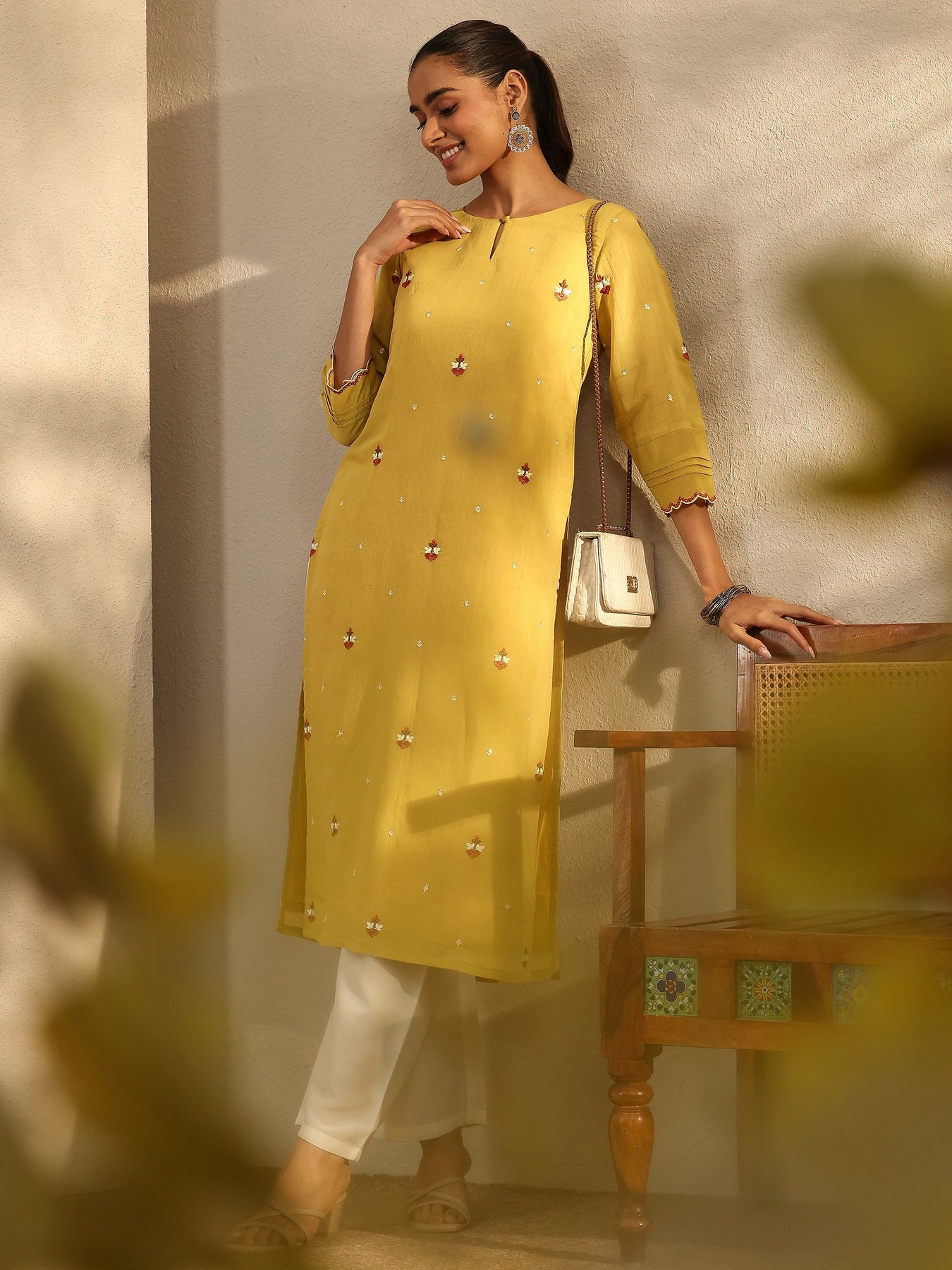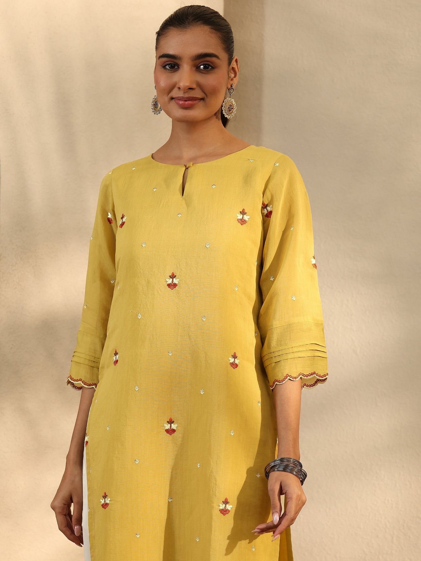 Our 1-piece yellow Chanderi cotton straight-fit kurta features a keyhole neckline, regular sleeves, and statement Yoke. Adorned with floral motifs embroidered, this style is perfect for Work Wear and Casual Wear.