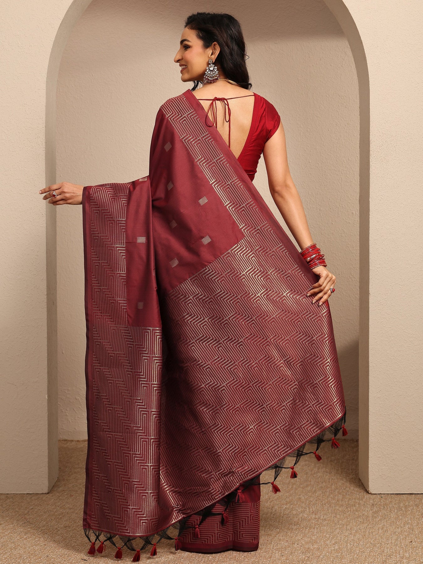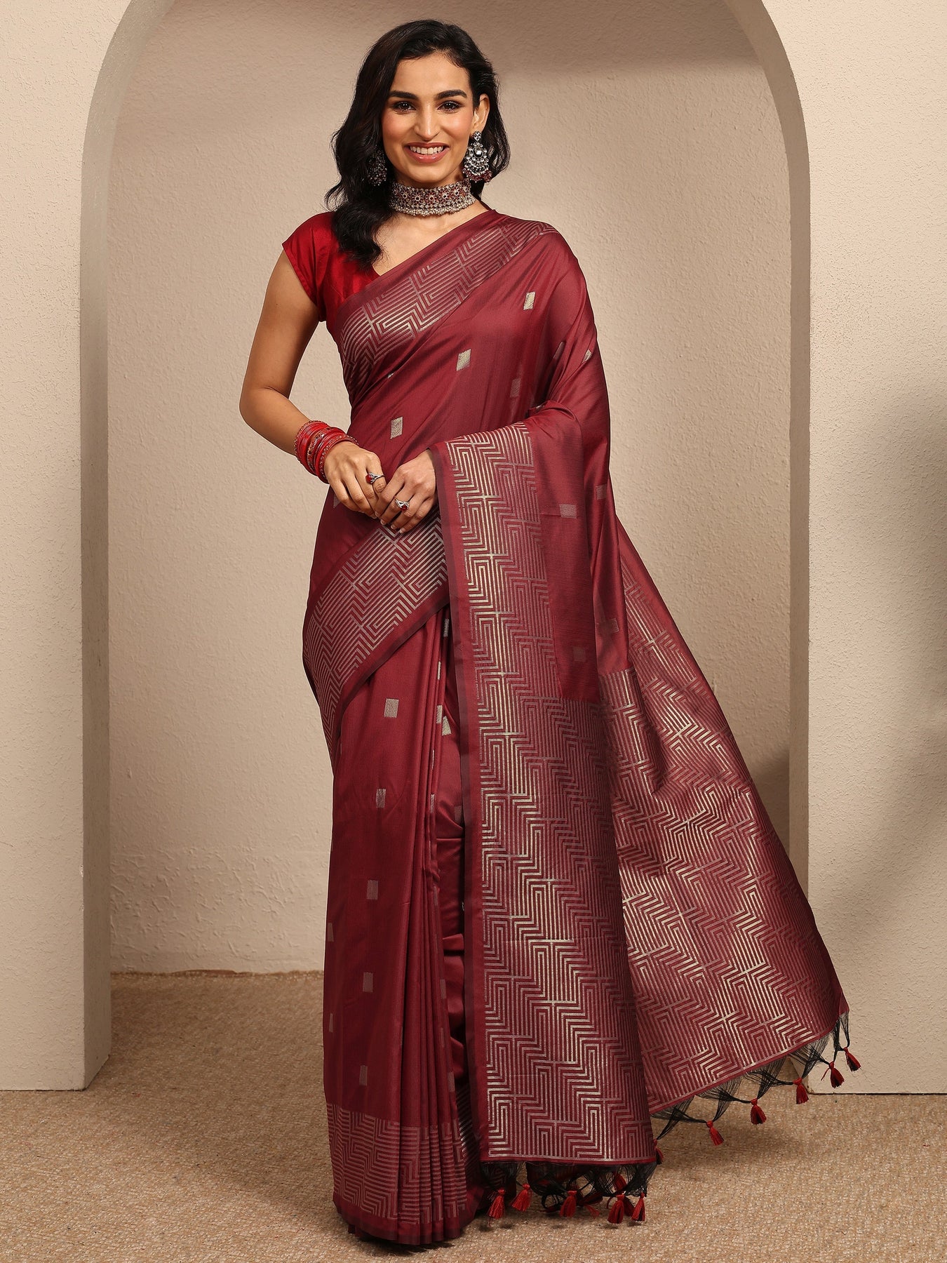 Maroon Geometric Woven Design Silk Blend Saree With Unstitched Blouse