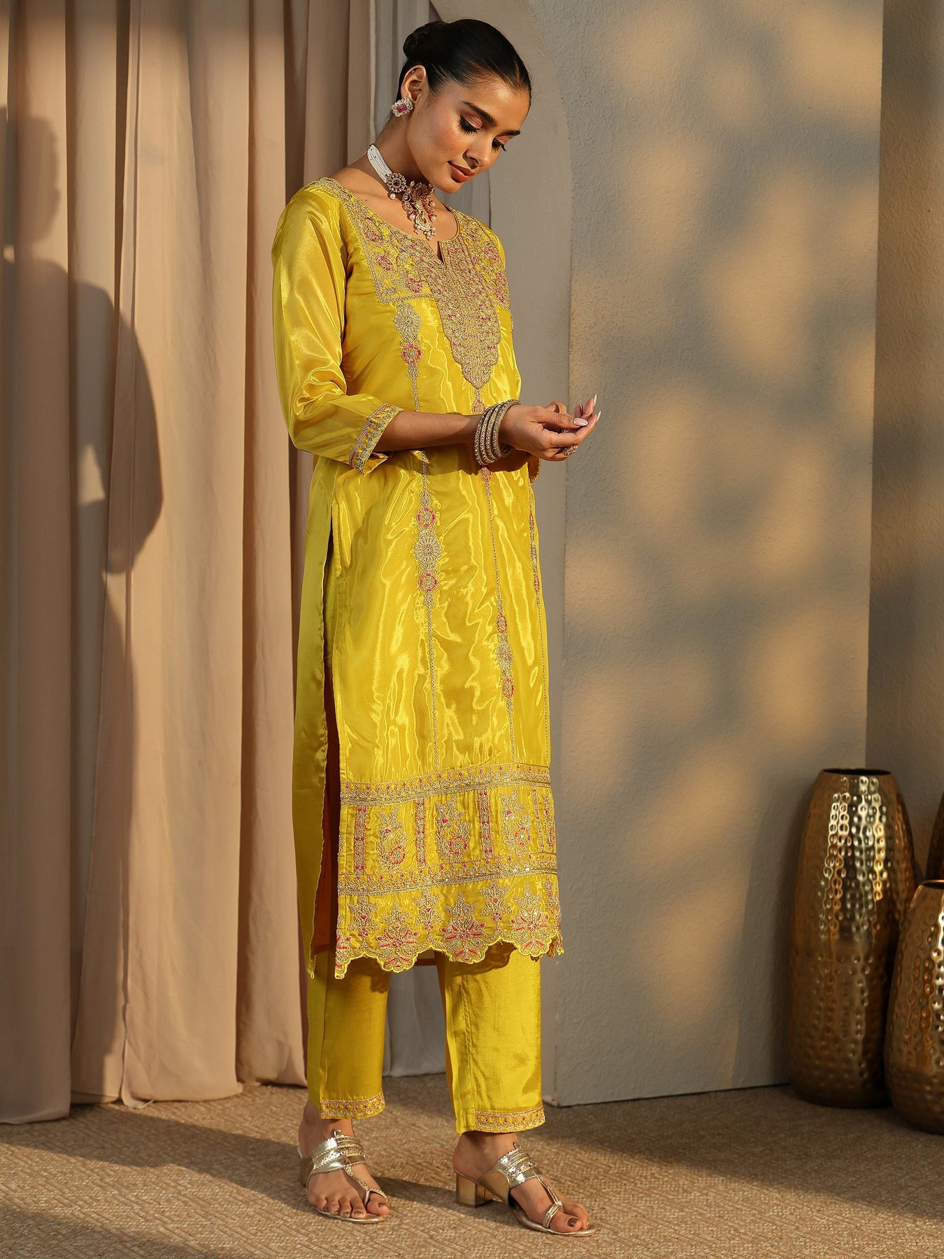 Our 3-piece yellow organza straight-fit kurta set features a sweetheart neckline, regular sleeves, and statement yoke. Complemented with lining and straight pants with a partially elasticated waistband, and an embroidered dupatta. Adorned with floral embellished, this style is perfect for festive occasions.