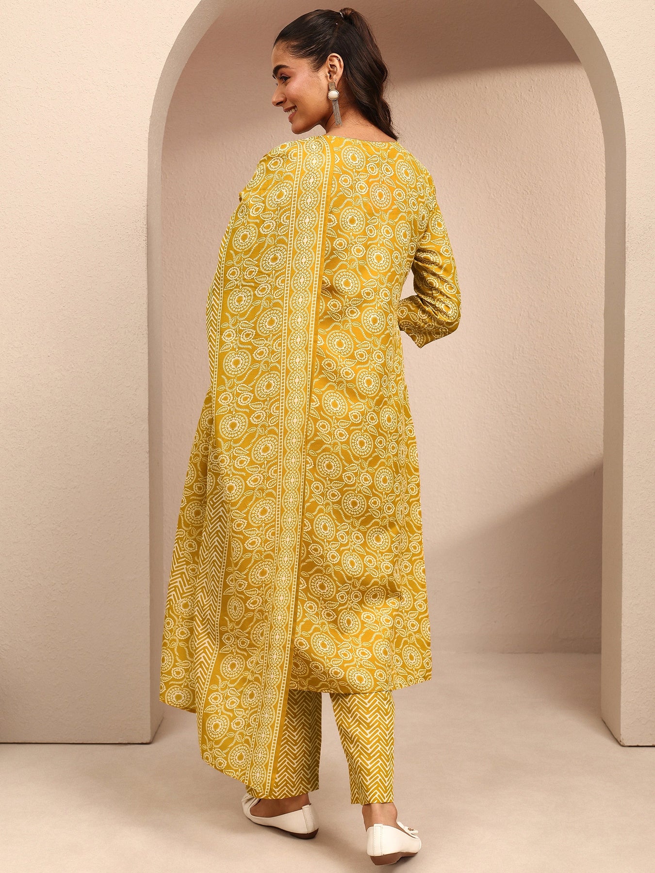 Our 3-piece yellow cotton blend straight-fit kurta set features a notched neckline, regular sleeves, and statement yoke. Complemented with straight pants with a partially elasticated waistband and 2 pockets, and a printed dupatta. Adorned with floral printed, this style is perfect for Work Wear and Casual Wear.