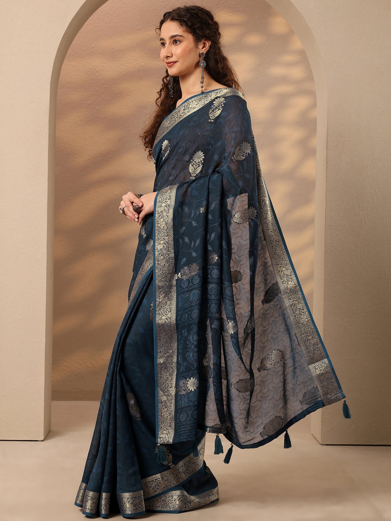 Our Blue Woven Design Silk Blend Saree Features Captivating Floral. Complemented With An Unstitched Blouse Piece. This Charming Saree Is Perfect For Festive Occasions.