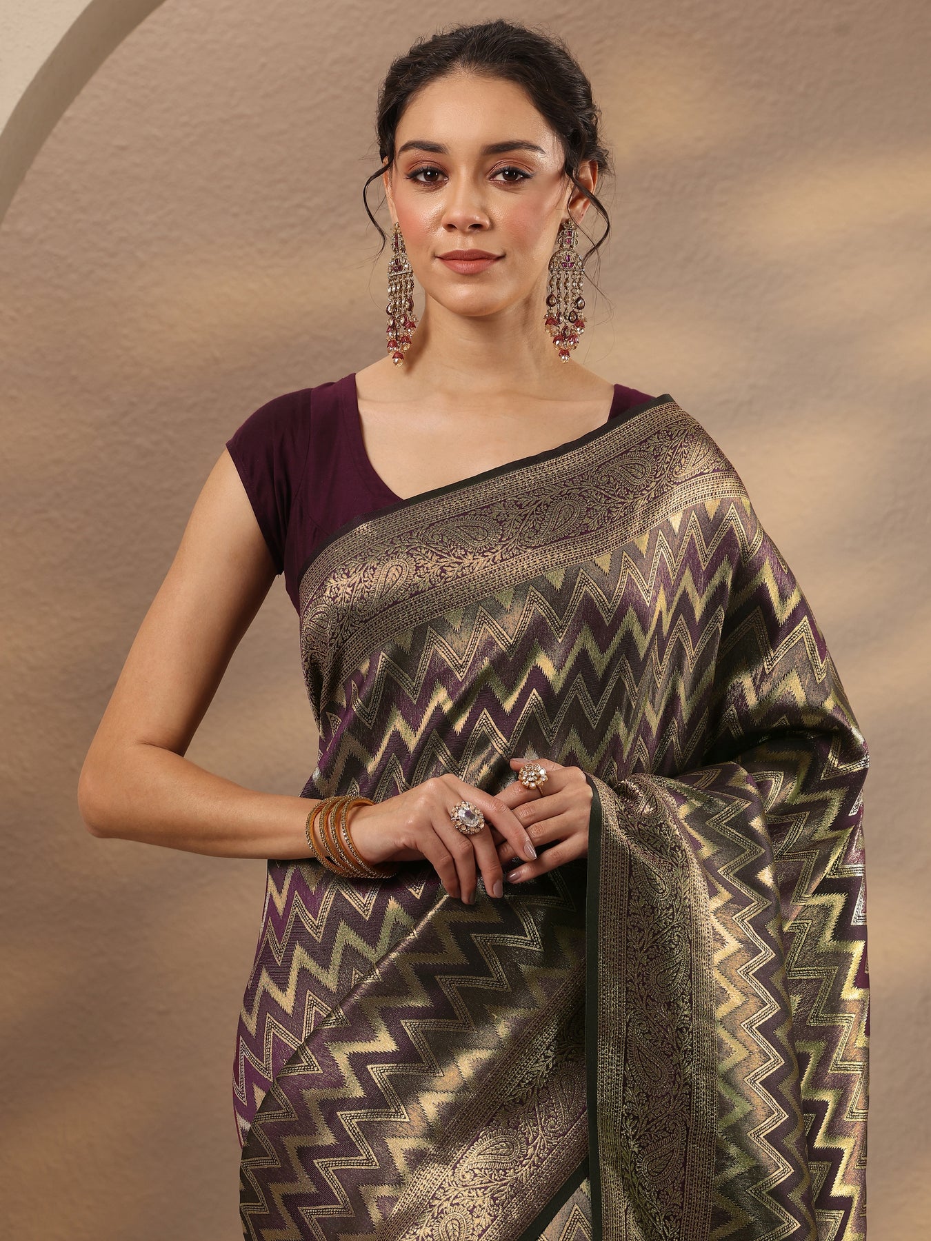 Burgundy Chevron Woven Design Silk Blend Saree With Unstitched Blouse Piece