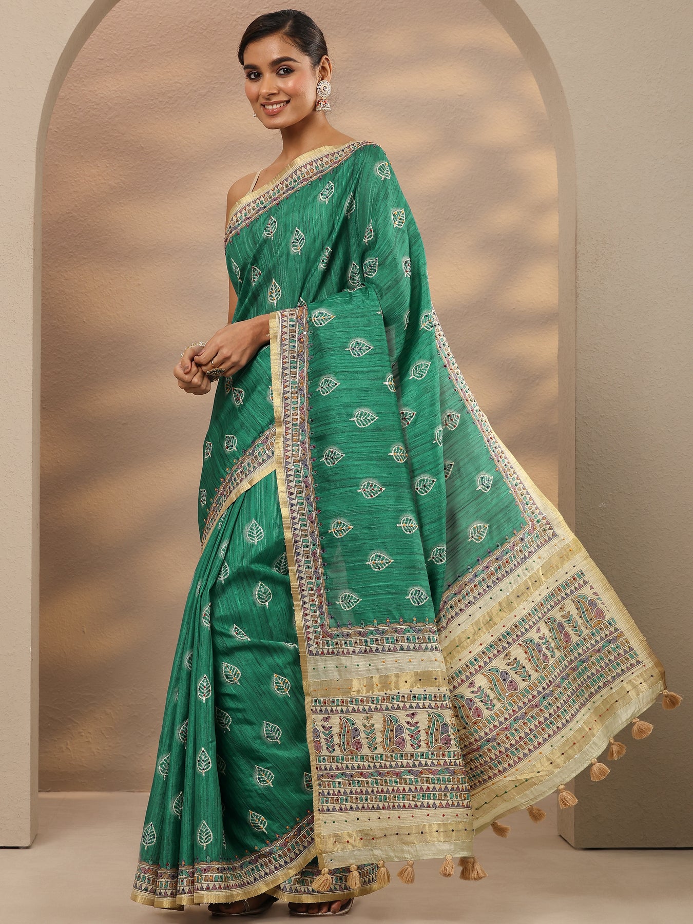 Our Green Printed Silk Blend Saree Features Captivating Ethnic Motif. Complemented With An Unstitched Blouse Piece. This Charming Saree Is Perfect For Festive Occasions.