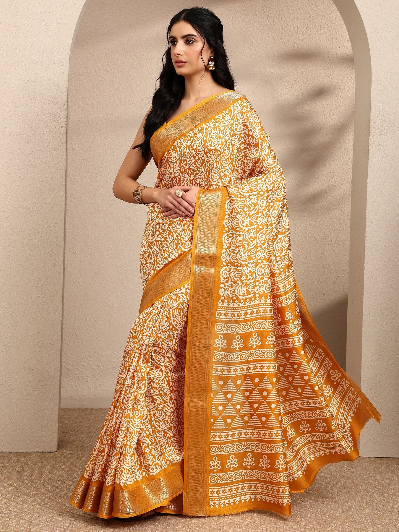 Mustard Printed Silk Blend Saree With Unstitched Blouse Piece