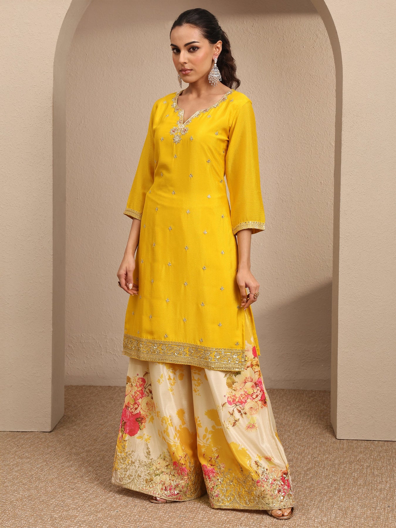 Our 3-piece yellow Chinon kurta set features a straight-fit kurta with a V-neckline, regular sleeves, and statement yoke. Complemented with flared palazzo pants with a partially elasticated waistband and an embroidered dupatta. Adorned with zari embroidered, this style is perfect for festive occasions.