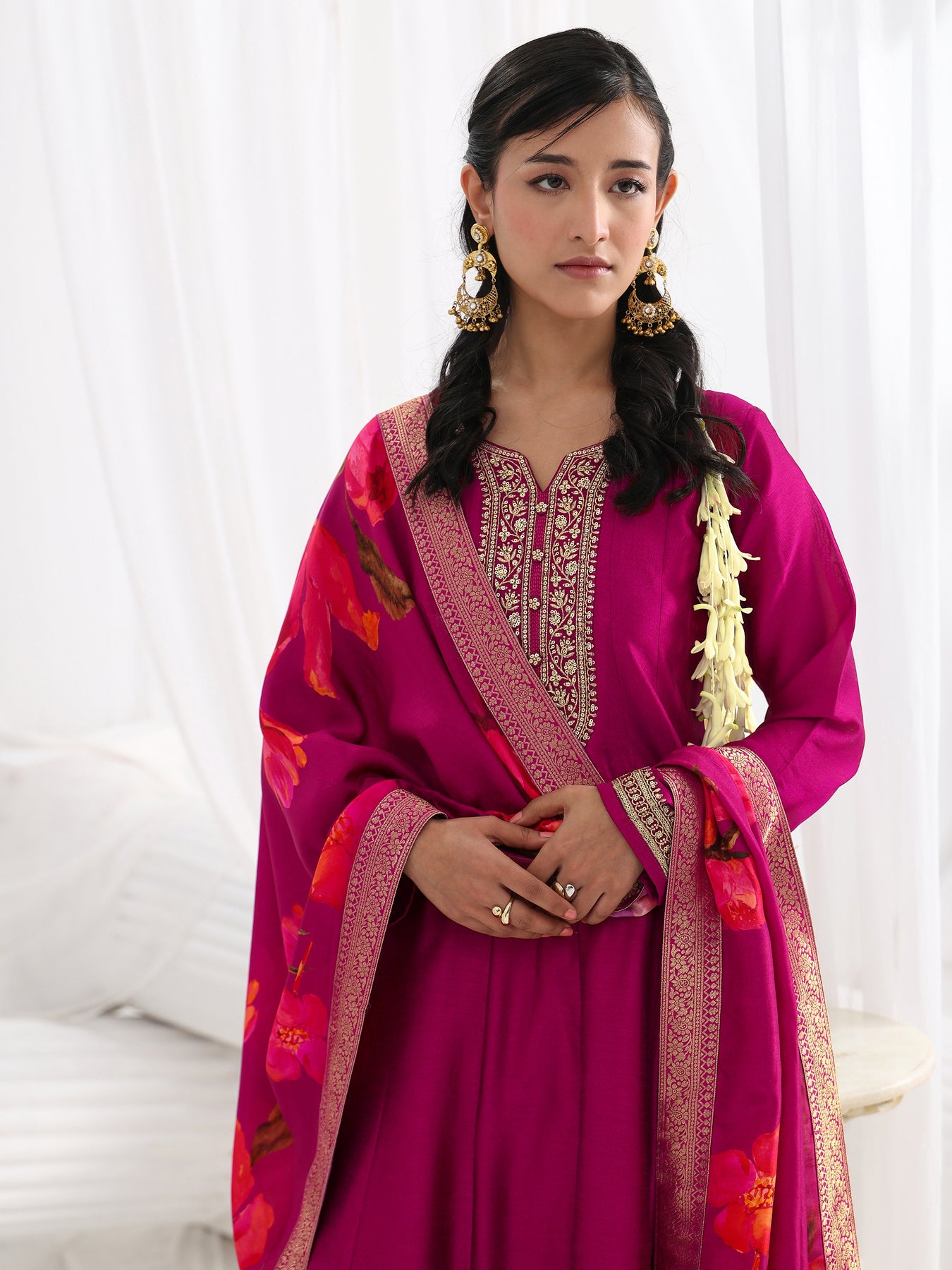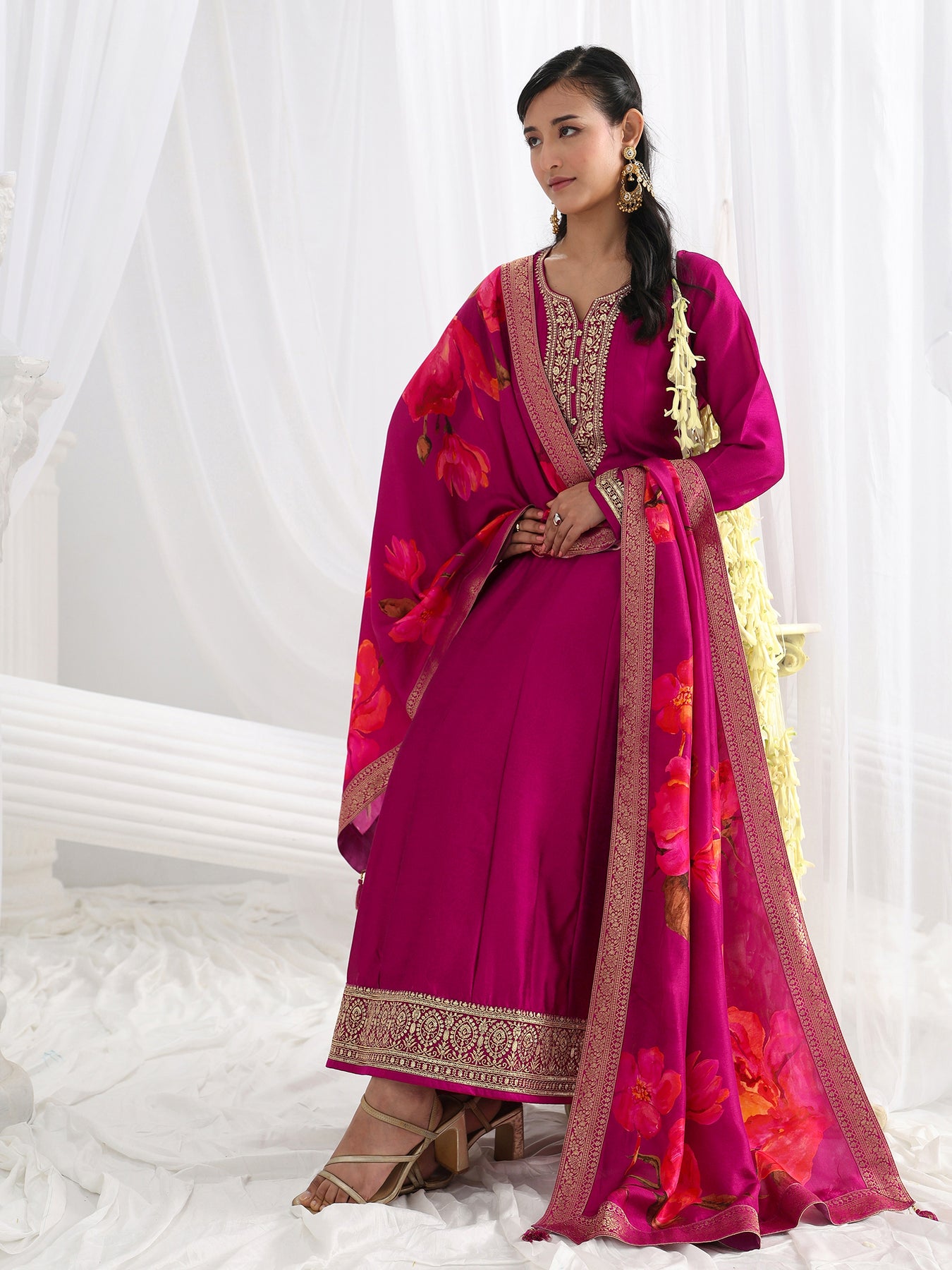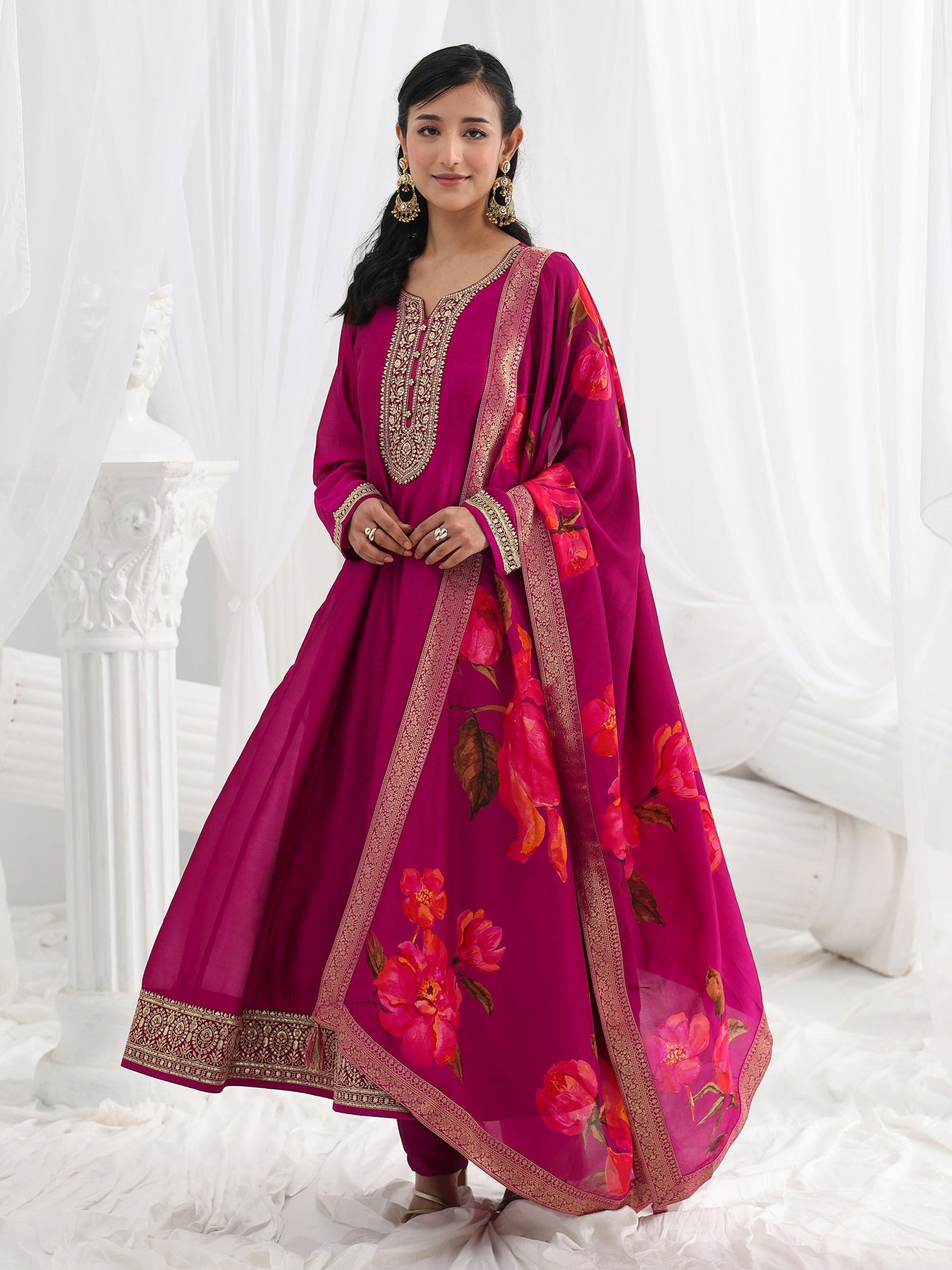 Our 3-piece Pink Silk blend Anarkali Kurta Set features a notched Neckline, Regular Sleeves, and statement Yoke. Complemented with Lining and Straight Pants with a Partially Elasticated waistband and 2 pockets, and a Printed dupatta. Adorned with floral zari embroidered, this style is perfect for Festive occasions.