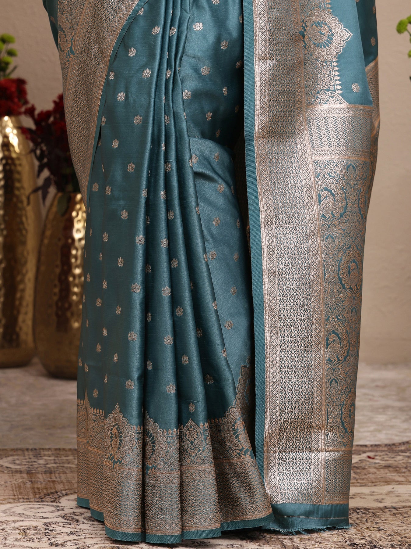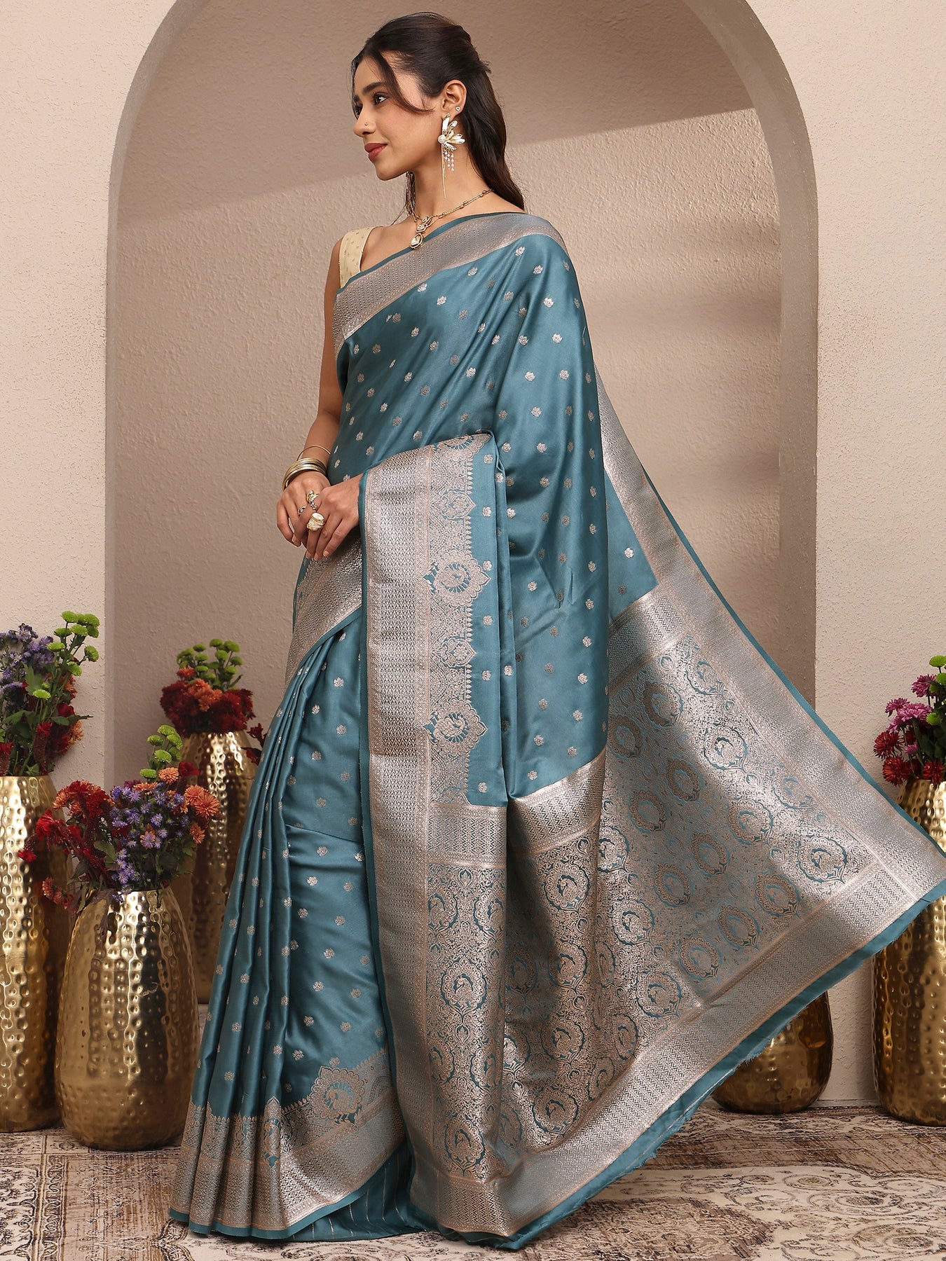 Blue Solid Silk Blend Saree With Unstitched Blouse Piece