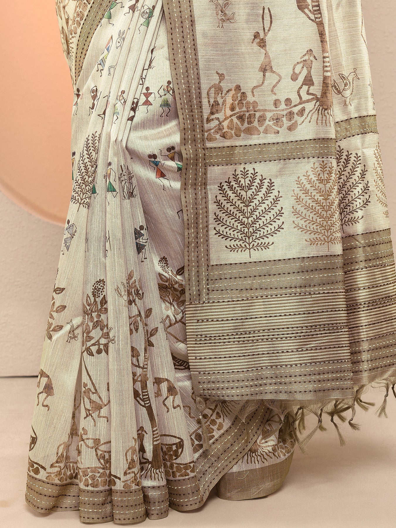 Beige Kalamkari Printed Sarees With Unstitched Blouse Piece