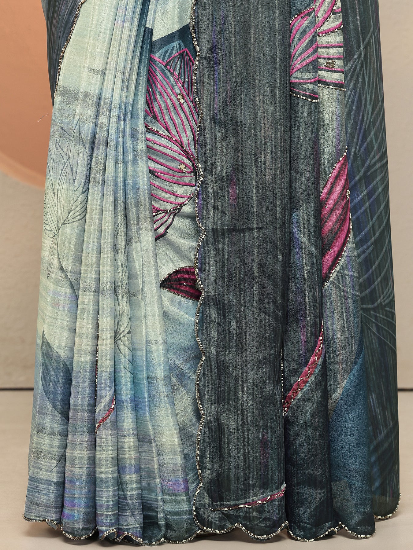 Navy Blue Printed Silk Blend Sarees With Unstitched Blouse Piece