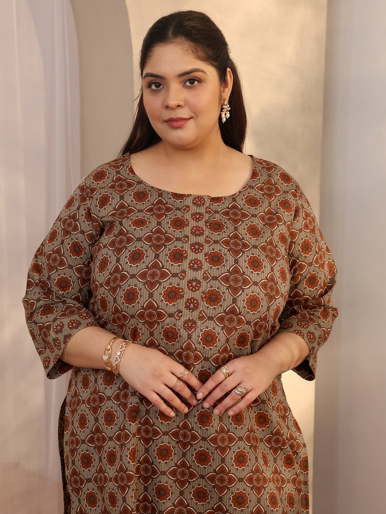 Our 3-piece brown cotton straight-fit kurta set features a round neckline, regular sleeves, and statement yoke. Complemented with straight pants with a partially elasticated waistband and 2 pockets, and a printed dupatta. Adorned with Floral Printed, this style is perfect for festive occasions.