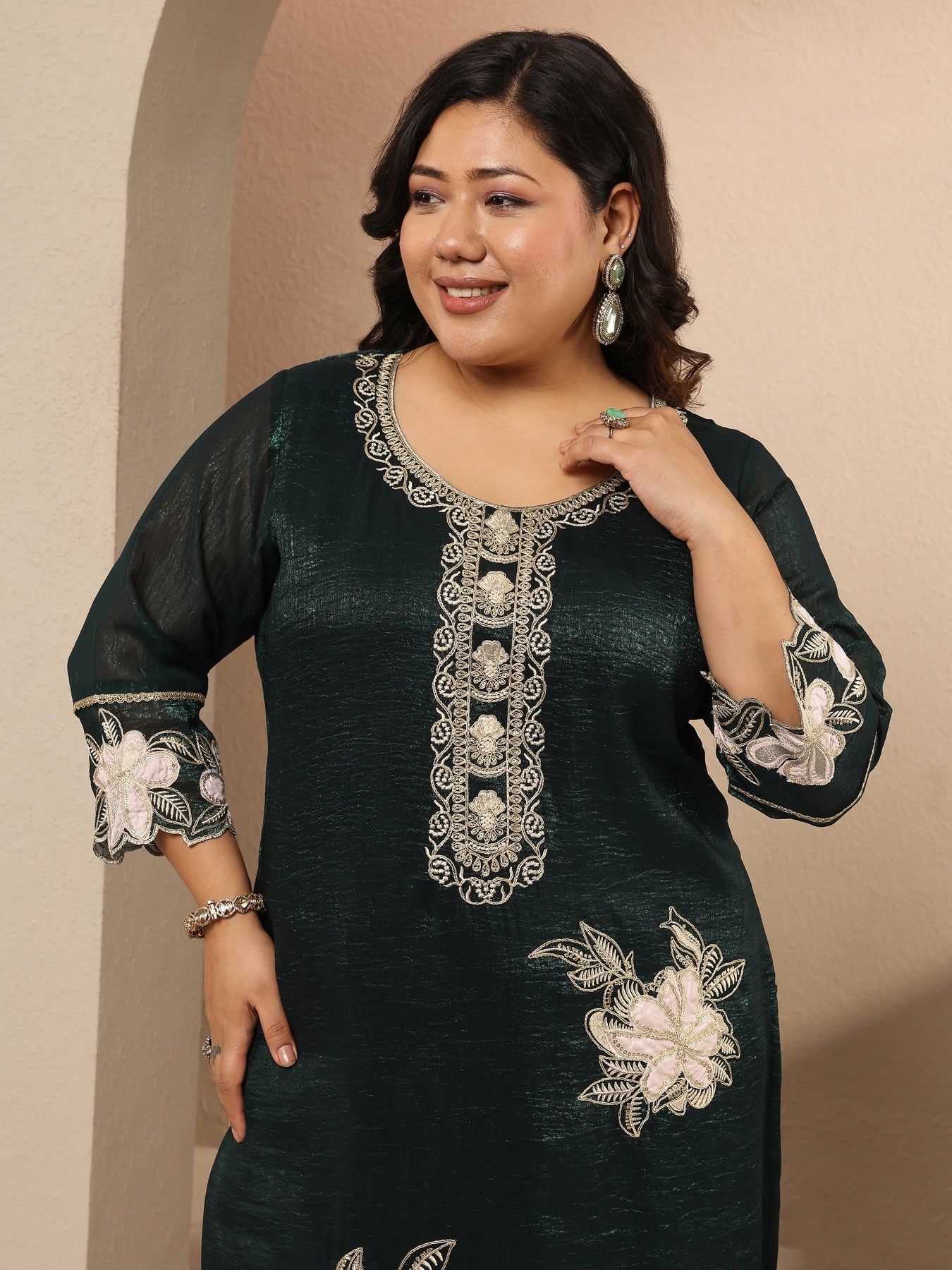 Plus Size Green Embroidered Chinon Straight Suit Set With Dupatta