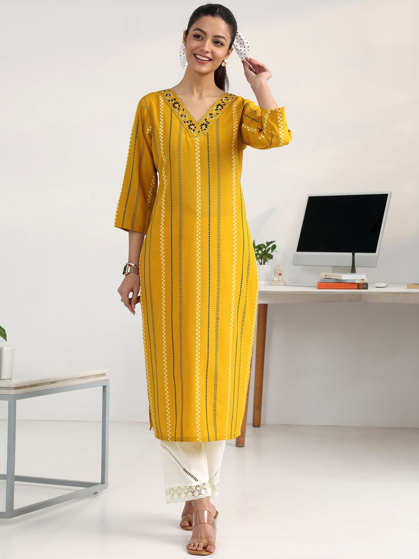 Our 1-piece mustard cotton blend straight-fit kurta features a V-neckline, regular sleeves, and statement yoke. Adorned with striped printed, this style is perfect for work wear and casual wear.
