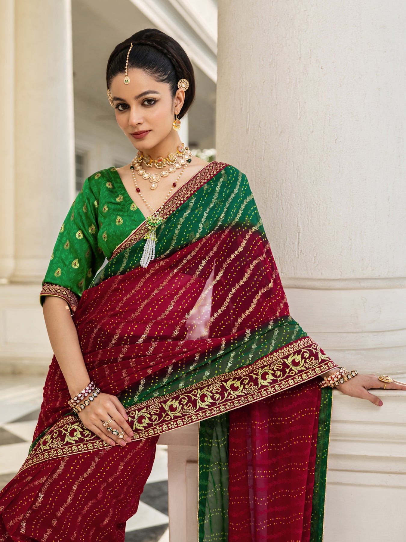 Our red printed georgette saree features captivating Bandhani print. Complemented with a blouse piece. This charming saree is perfect for festive occasions.