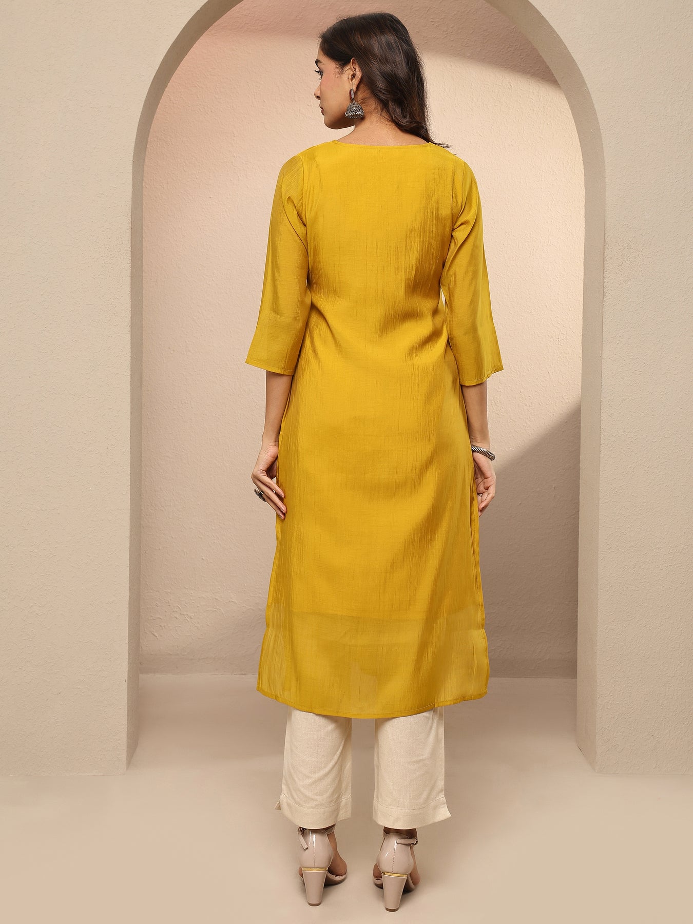 Our 1-piece mustard Chanderi cotton straight-fit kurta features a V-neckline, regular sleeves and statement Yoke. Adorned with sequinned , this style is perfect for festive occasions.