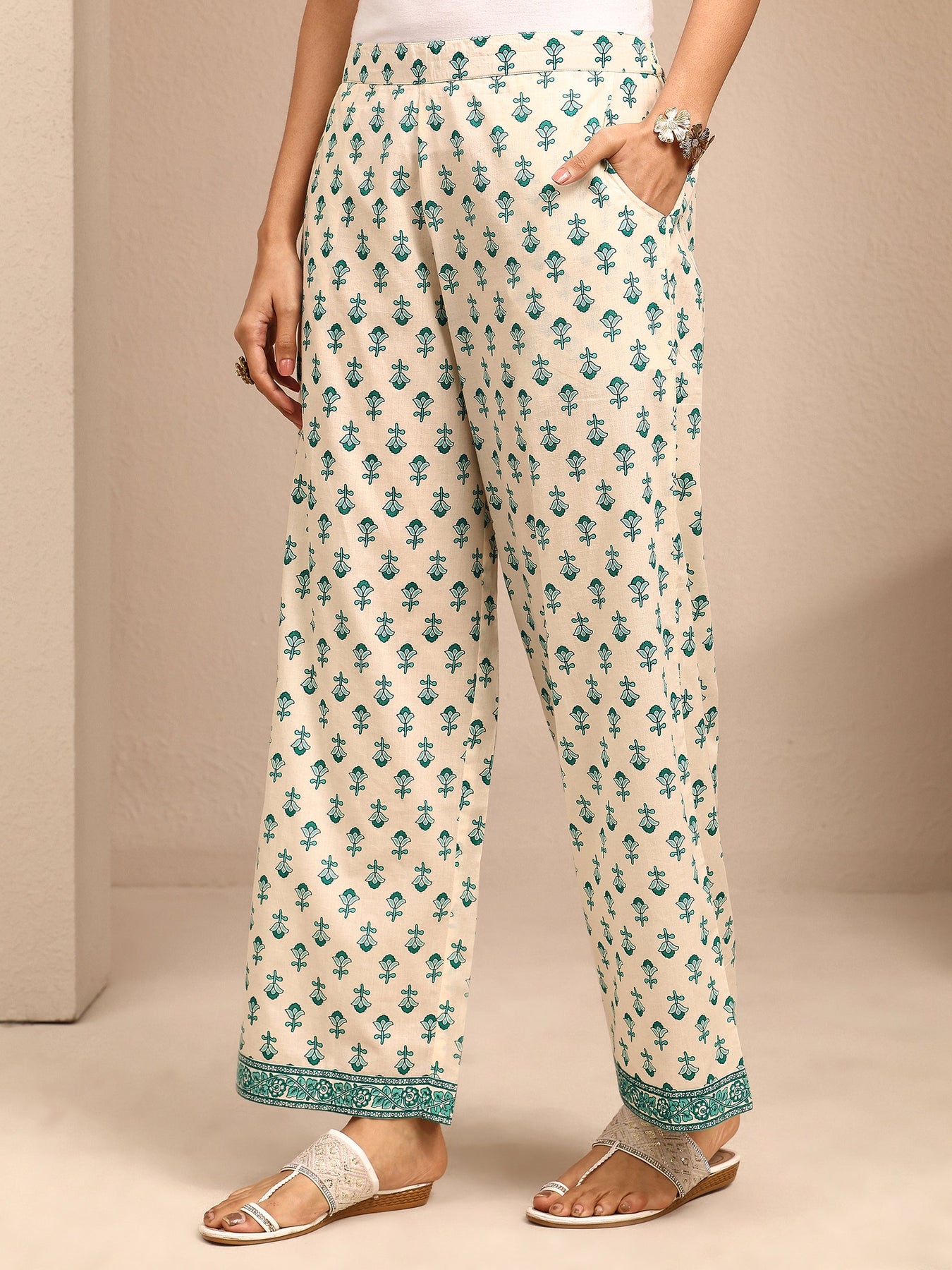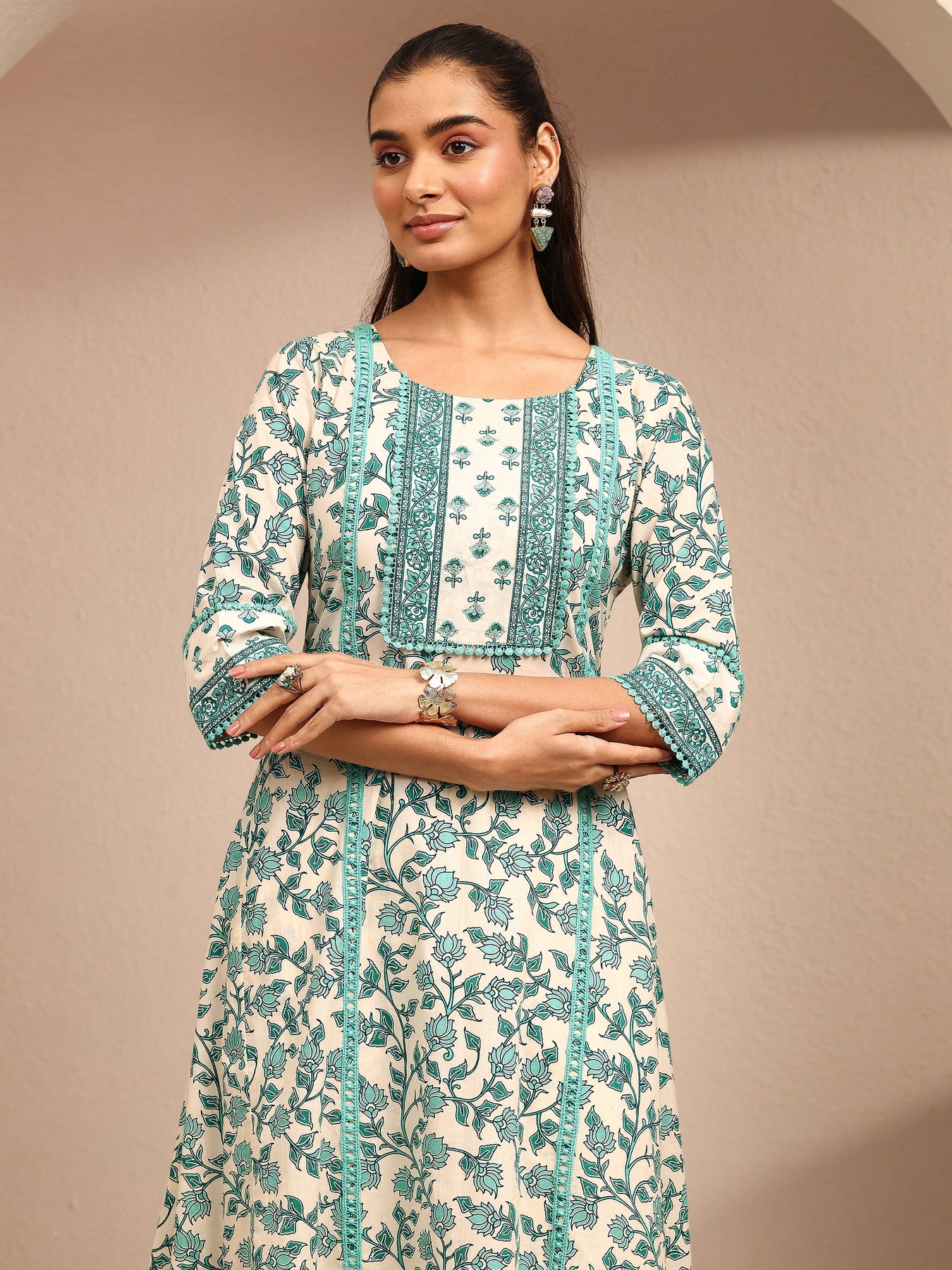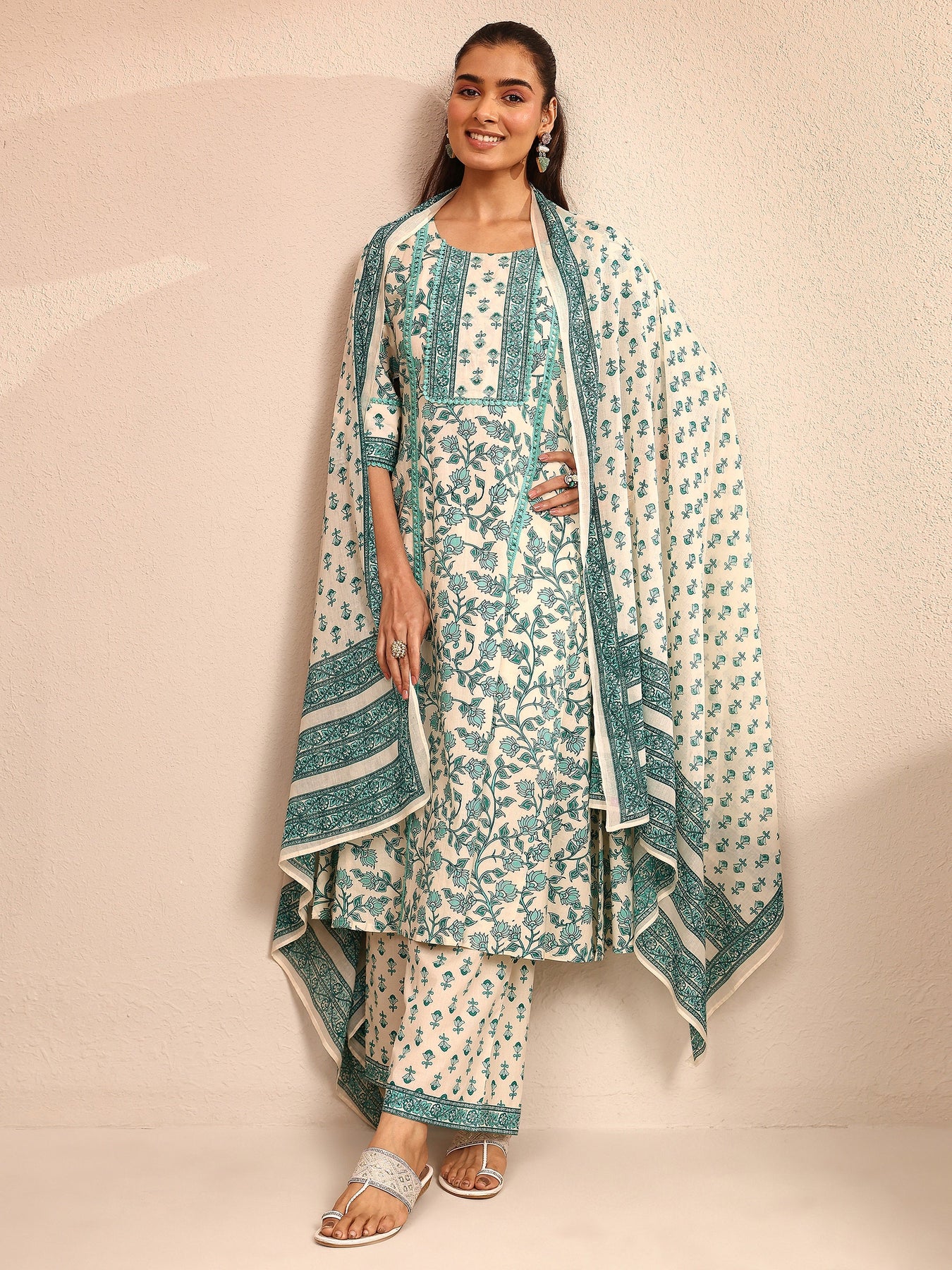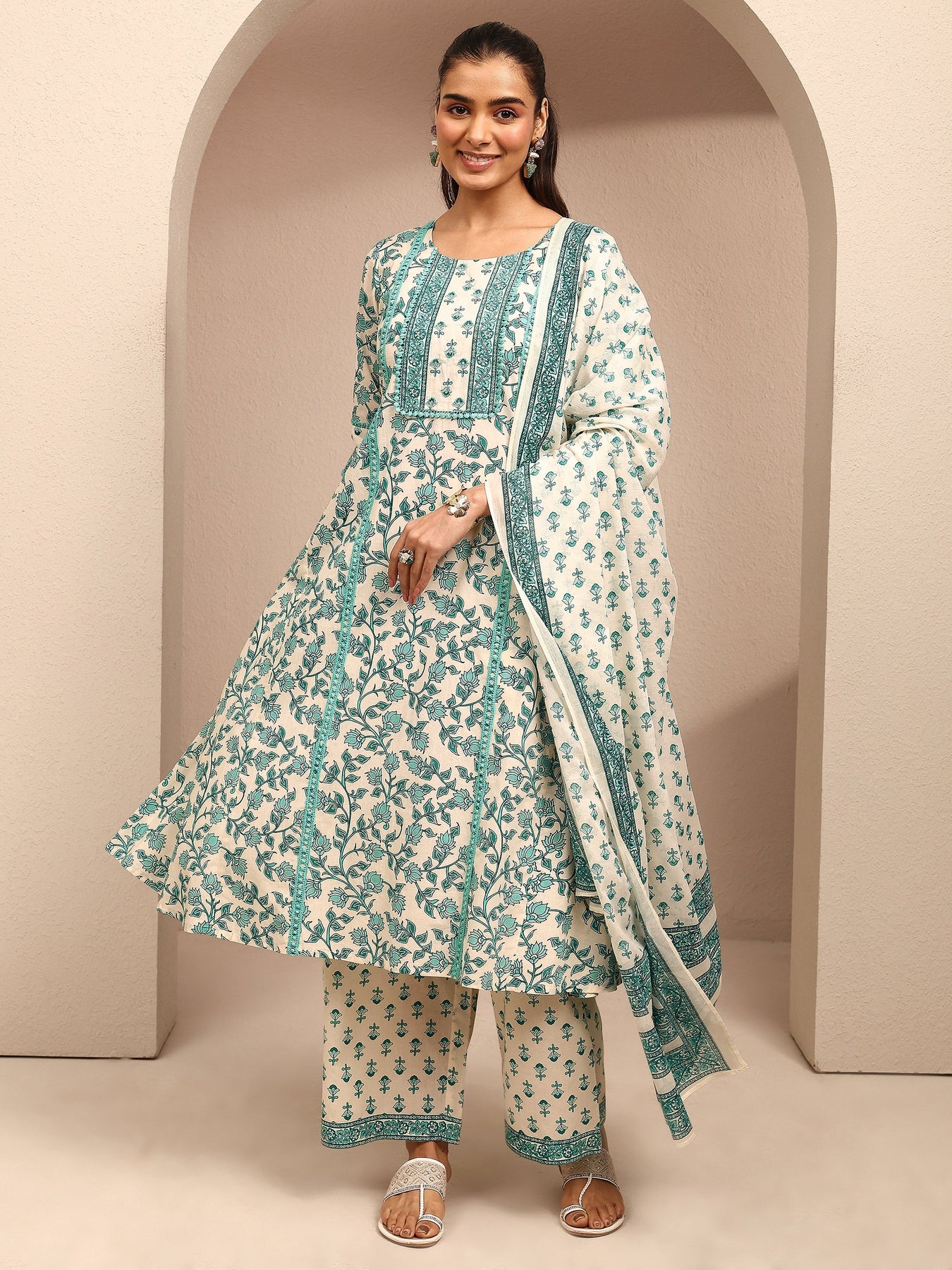 Our 3-piece off white and teal cotton Anarkali kurta set features a round neckline, regular sleeves, and a statement yoke. Complemented with straight pants with a partially elasticated waistband and 2 pockets, and a floral dupatta. Adorned with floral printed, this style is perfect for festive occasions.