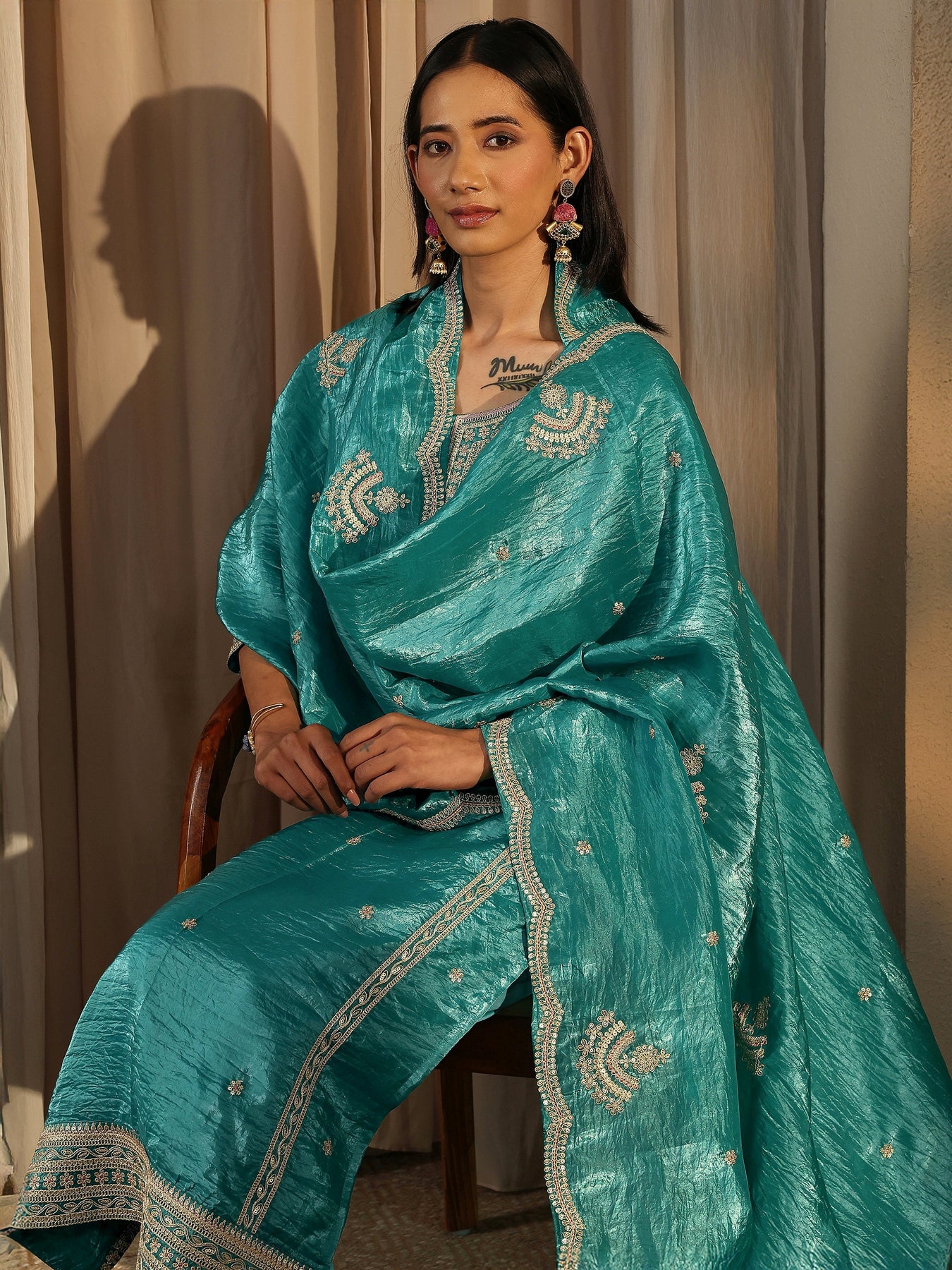 Our 3-piece teal organza straight-fit kurta set features a round neckline, regular sleeves, and statement yoke. Complemented with lining and straight pants with a partially elasticated waistband and 2 pockets, and an embroidered dupatta. Adorned with ethnic motif embroidered, this style is perfect for festive occasions.