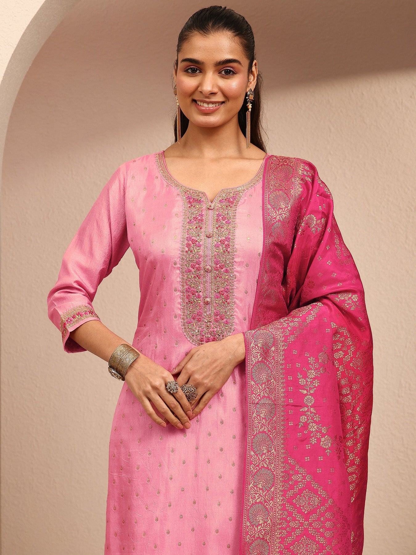 Pink Embroidered Silk Blend Straight Suit Set With Dupatta