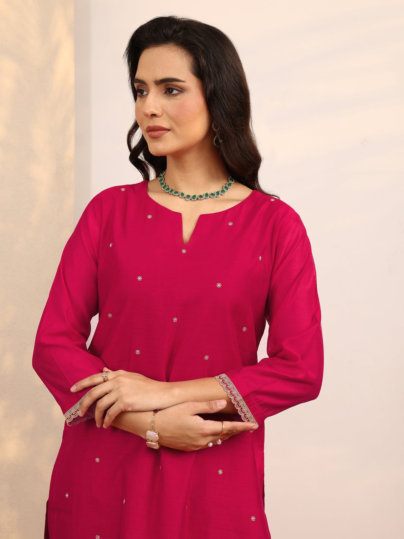 Our 3-piece Pink Silk blend Straight-fit Kurta Set features a Notched Neckline, Regular Sleeves, and statement yoke. Complemented with Straight Pants with a Partially Elasticated waistband and 2 pockets, and an Embroidered dupatta. Adorned with floral thread work, this style is perfect for Festive occasions.