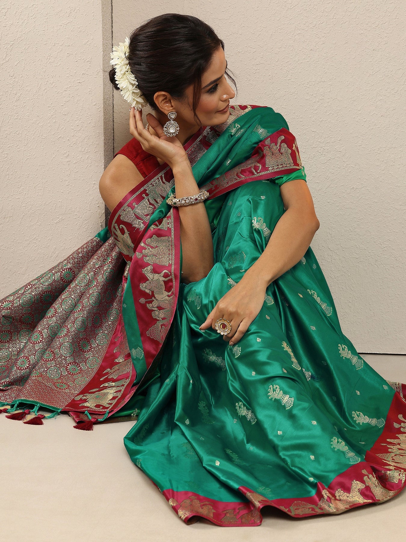 Green Woven Design Silk Blend Sarees With Unstitched Blouse Piece