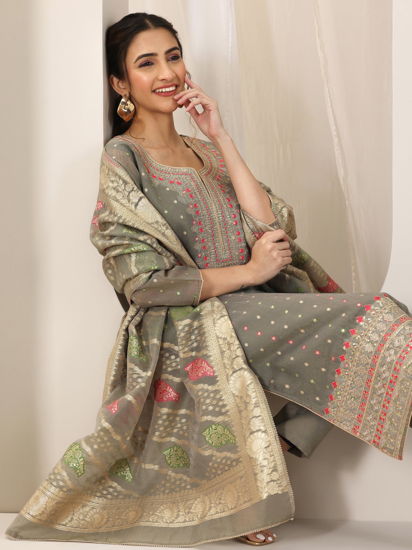 Grey Woven Design Chanderi Silk Straight Suit Set With Dupatta
