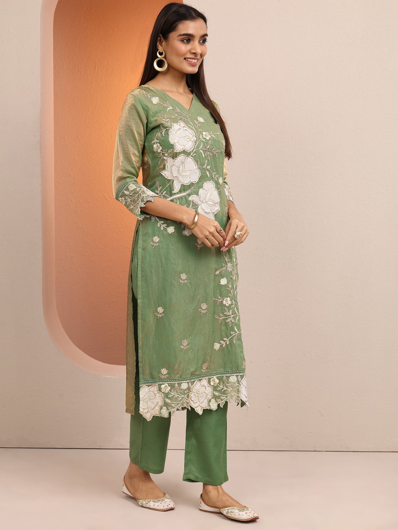 Our 3-piece Green Organza Straight-Fit Kurta Set features a V-Neckline, Regular Sleeves, and statement yoke. Complemented with Lining and Straight Pants with a Partially Elasticated waistband and 2 pockets, and an Embroidered dupatta. Adorned with floral embroidered, this style is perfect for Festive occasions.