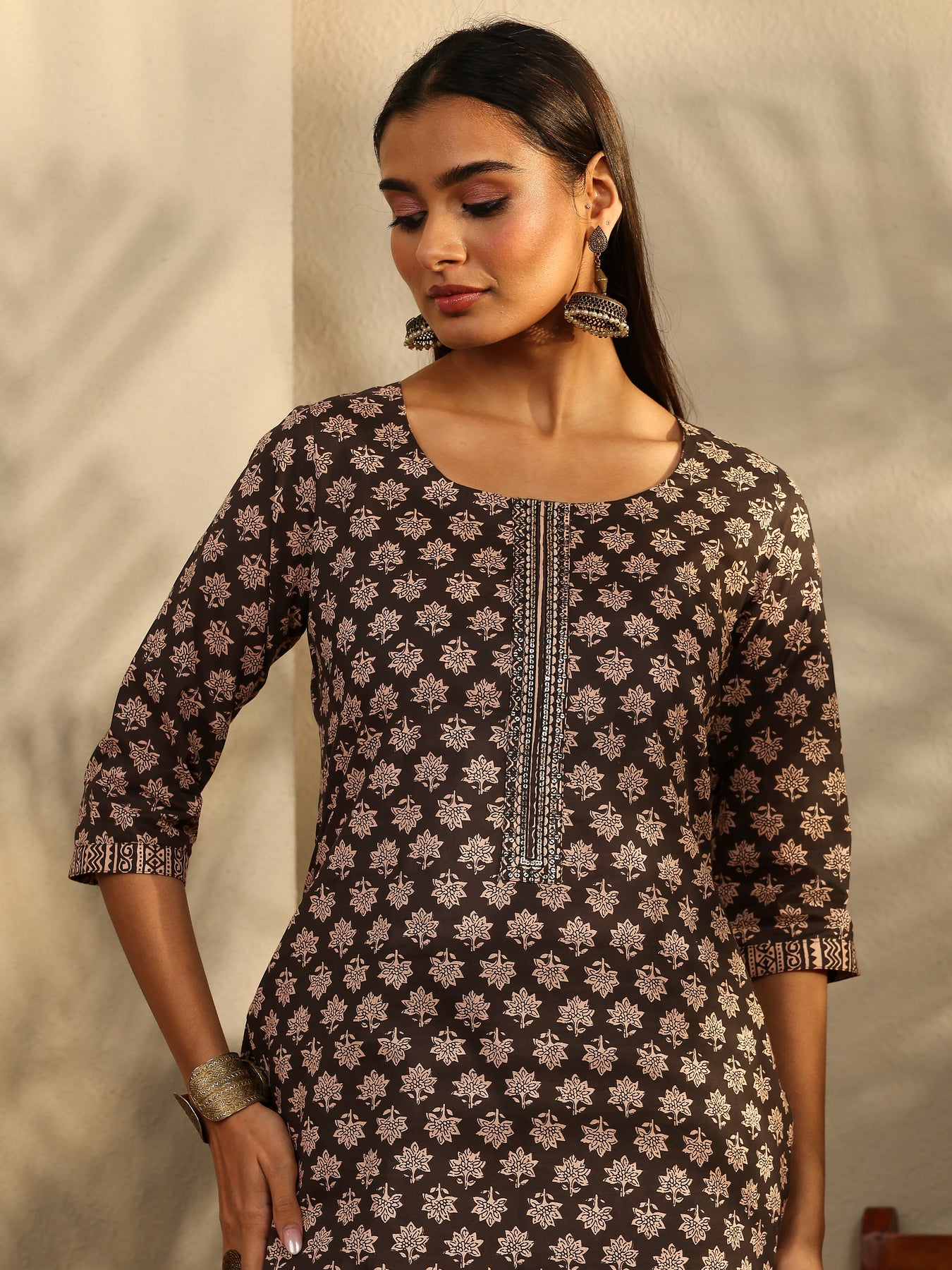 Our 3-piece black printed cotton blend suit set features a kurta with a round neckline and three-quarter sleeves. Complemented with trousers with a partially elasticated waistband and roomy pockets, and a dupatta. Highlighted with sequins and ethnic motifs prints, this style is perfect for elevated everyday style.