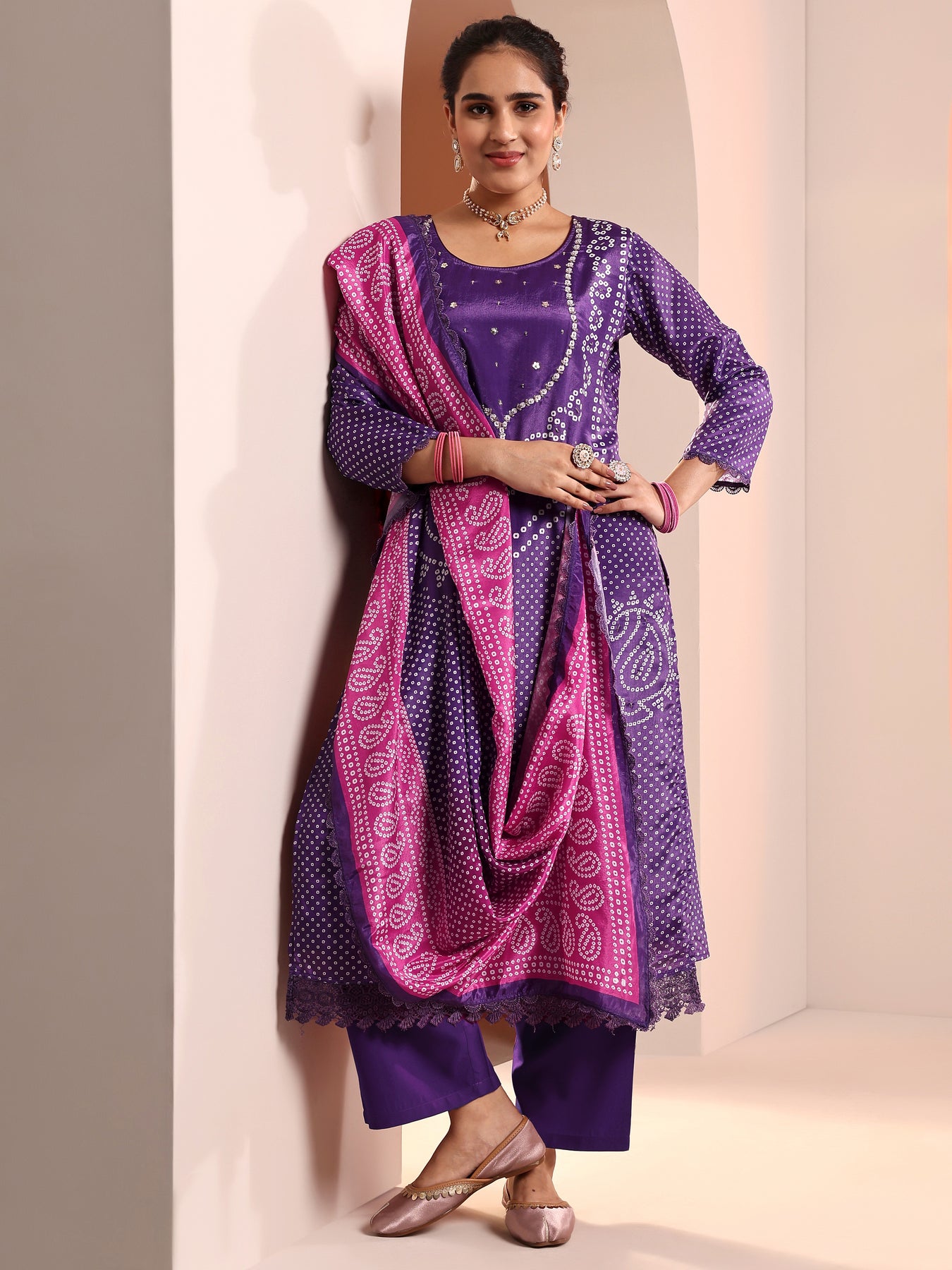 Our 3-piece purple Chinon straight-fit kurta set features a round neckline, regular sleeves, and statement yoke. Complemented with lining and straight pants with a partially elasticated waistband and 2 pockets, and a dupatta with Bandhani inspired print. Adorned with Bandhani inspired print, this style is perfect for dark festive occasions.
