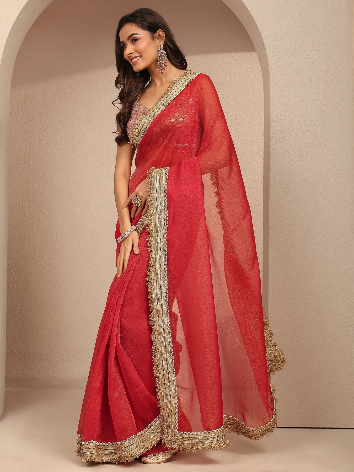 Red Solid Silk Blend Saree With Unstitched Blouse Piece