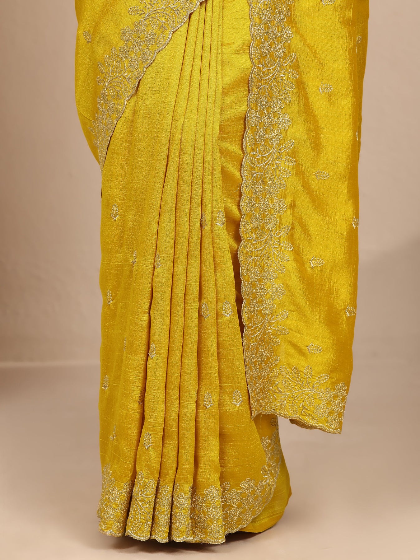 Our yellow silk blend saree features captivating embellishments. Complemented with an unstitched blouse piece. This charming saree is perfect for festive occasions.
