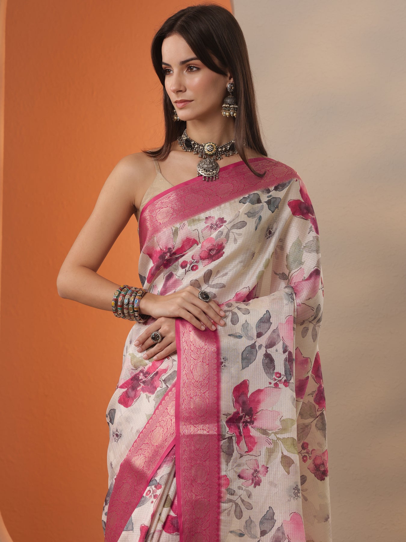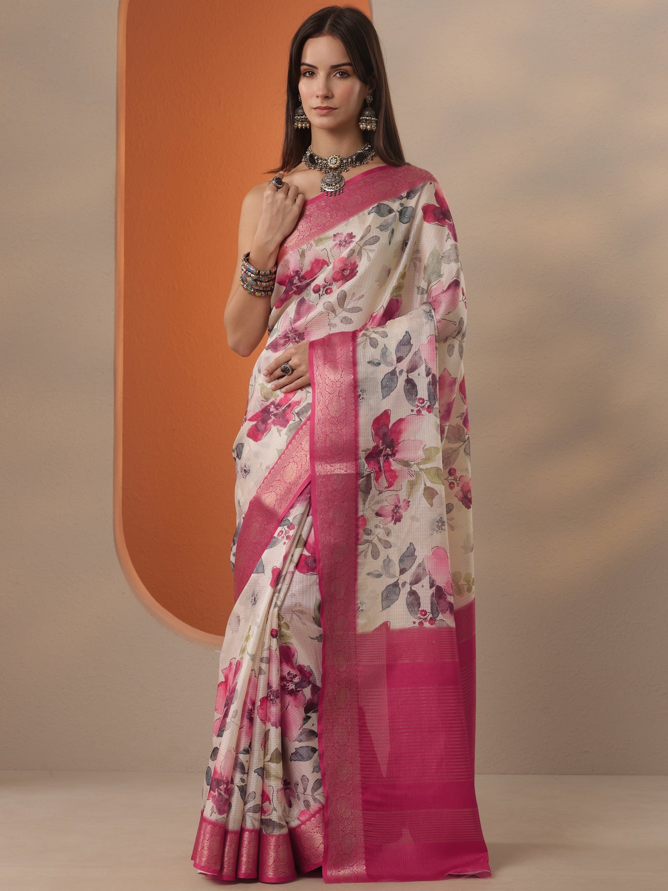 Beige Printed Kota Saree With Unstitched Blouse Piece