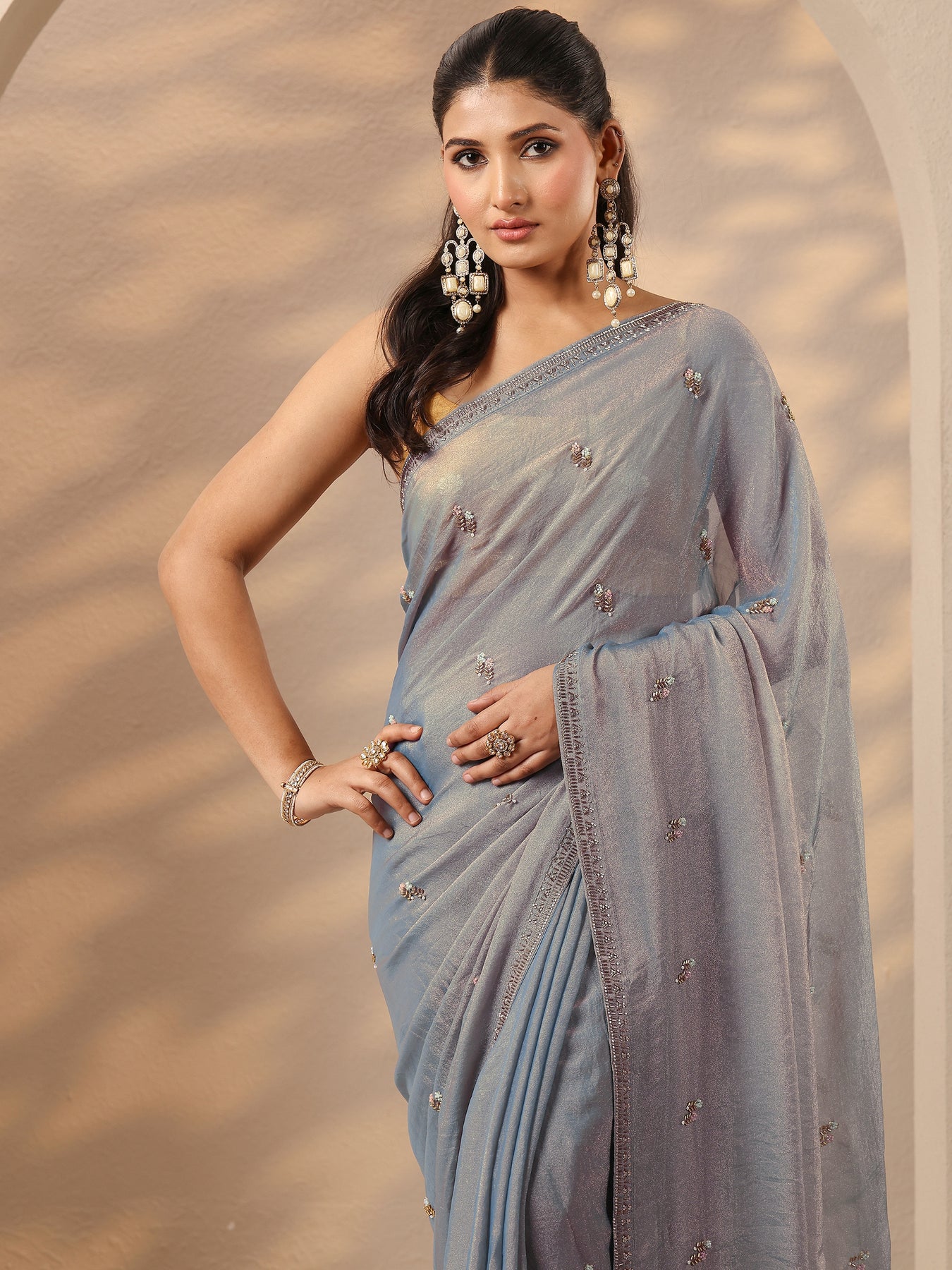 Our Blue Embroidered Silk Blend Saree Features Captivating Embellished. Complemented With An Unstitched Blouse Piece. This Charming Saree Is Perfect For Festive Occasions.
