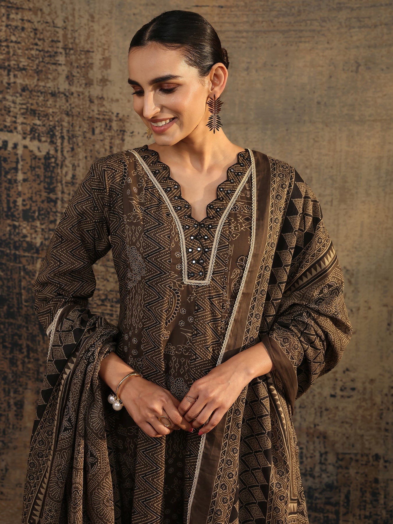 Brown Printed Cotton Straight Suit Set With Dupatta