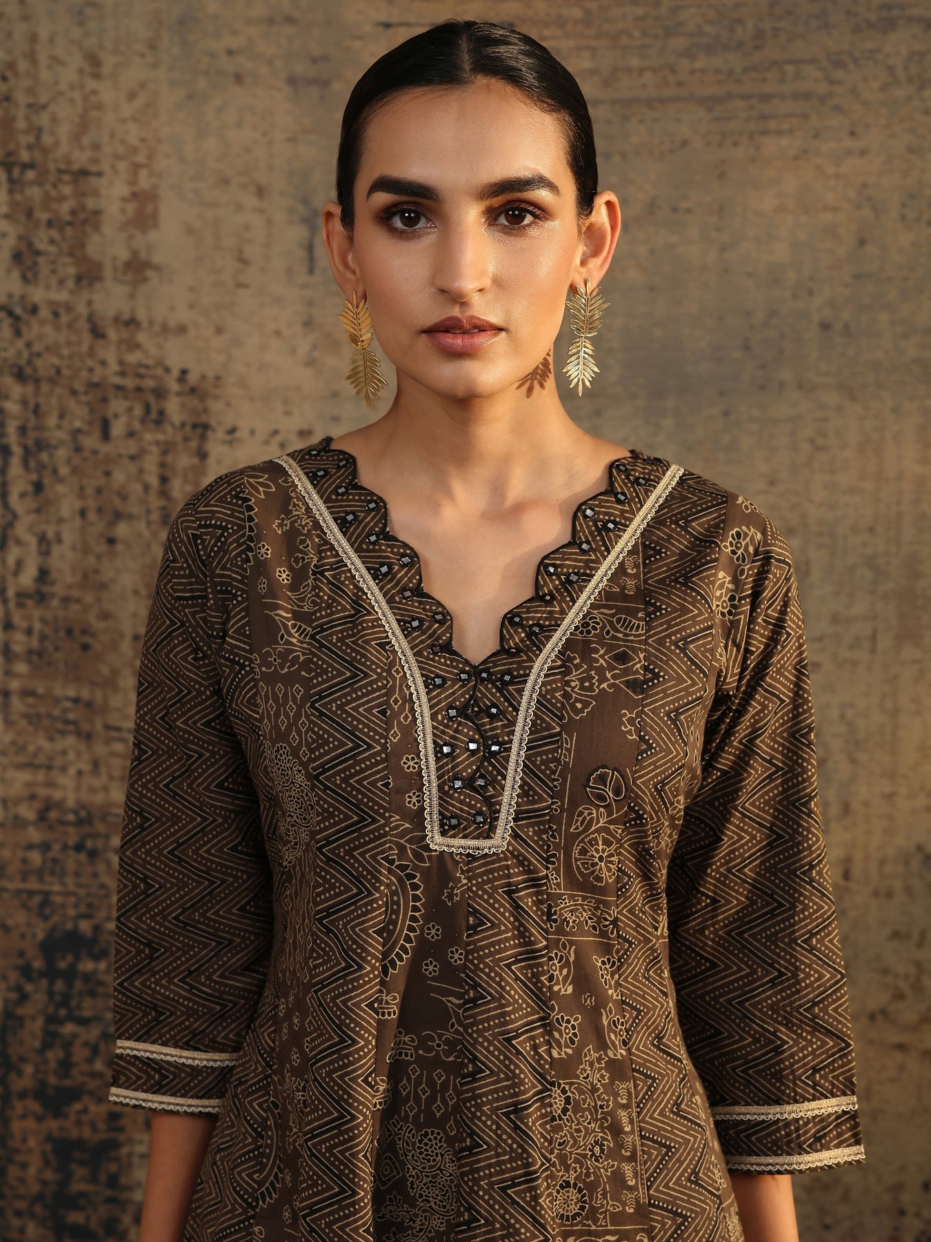 Our 3-piece brown cotton straight-fit kurta set features a V-neckline, regular sleeves, and statement yoke. Complemented with straight pants with a partially elasticated waistband and 2 pockets, and a printed dupatta. Adorned with [toppattern not found], this style is perfect for dark festive occasions.