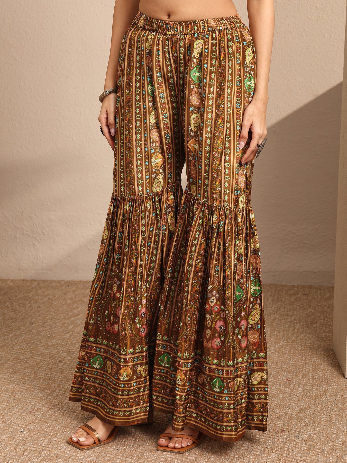 Our 3-piece brown crepe kurta set features a straight-fit kurta with a round neckline, flared sleeves, and statement yoke. Complemented with lining and sharara pants with a partially elasticated waistband, and an embroidered dupatta. Adorned with ethnic motif printed, this style is perfect for dark festive occasions.