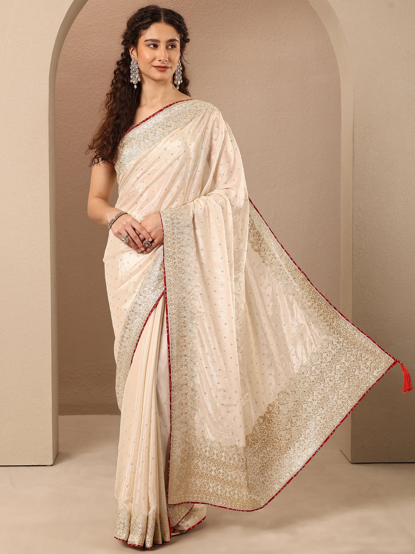 Cream Embellished Silk Blend Saree With Unstitched Blouse Piece