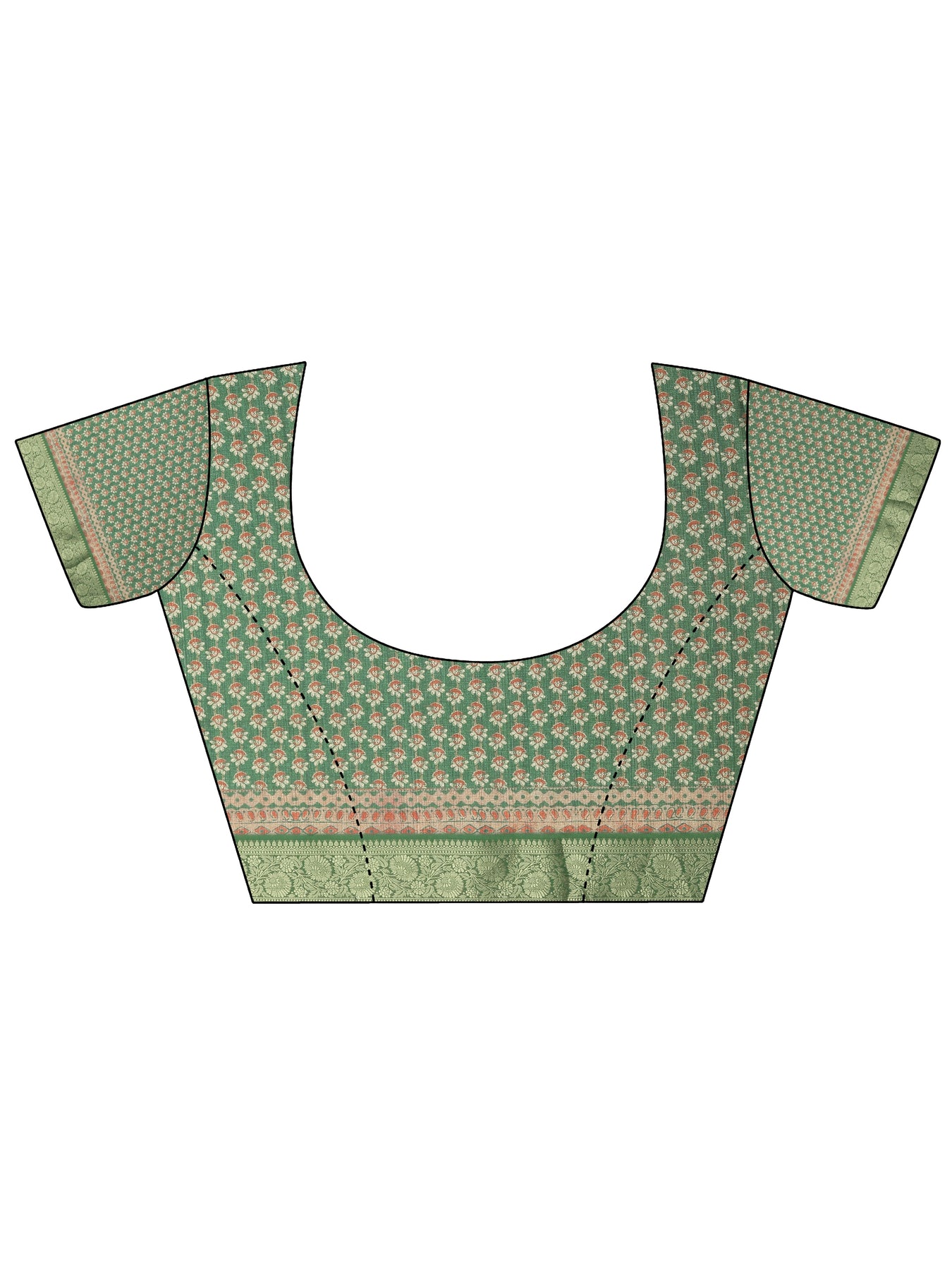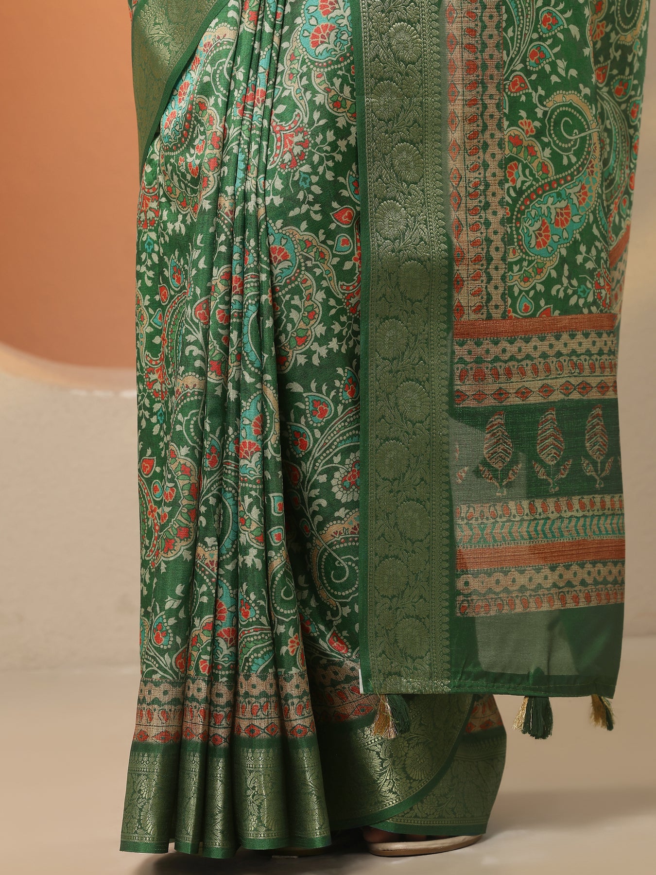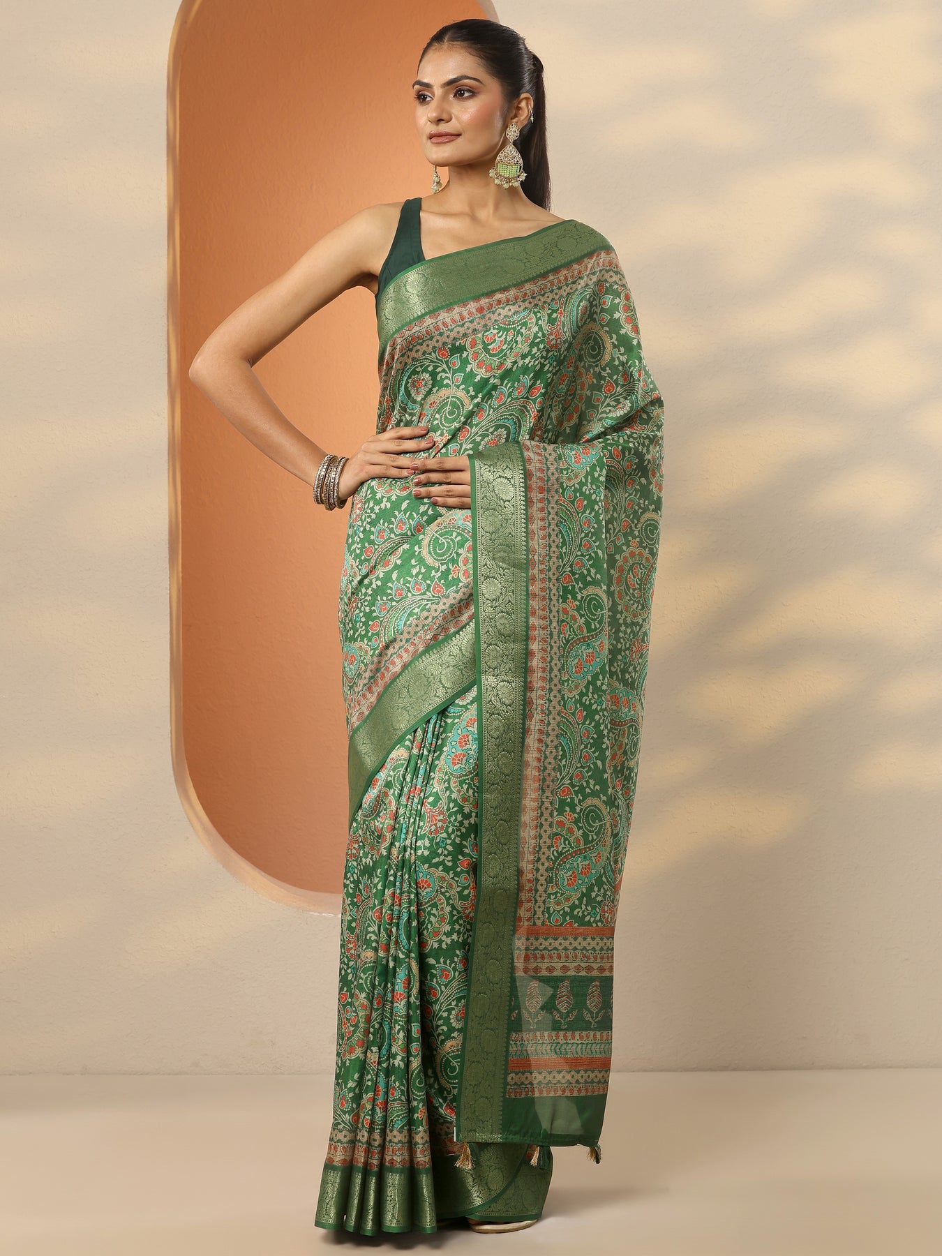 Green Printed Silk Blend Saree With Unstitched Blouse Piece