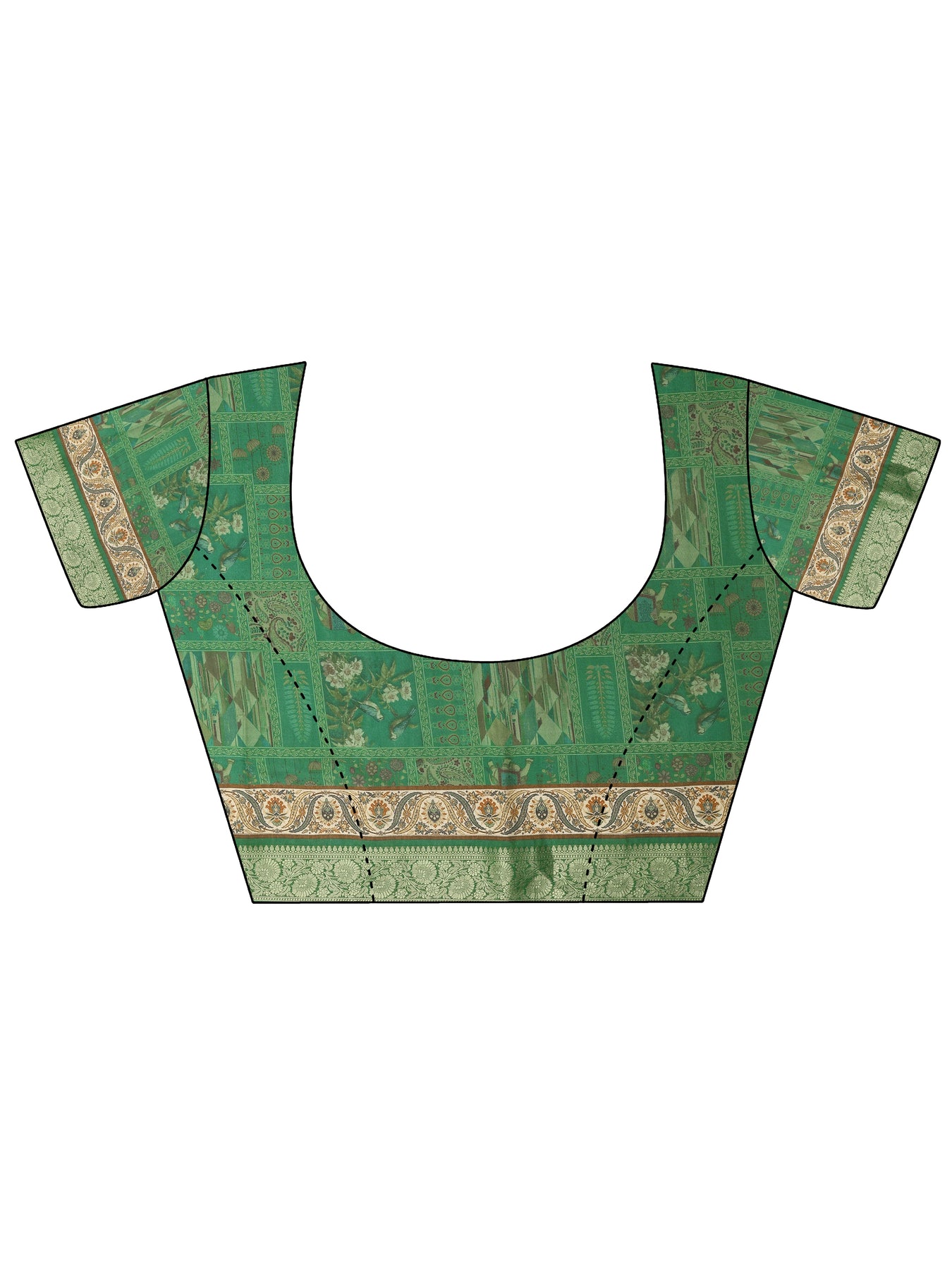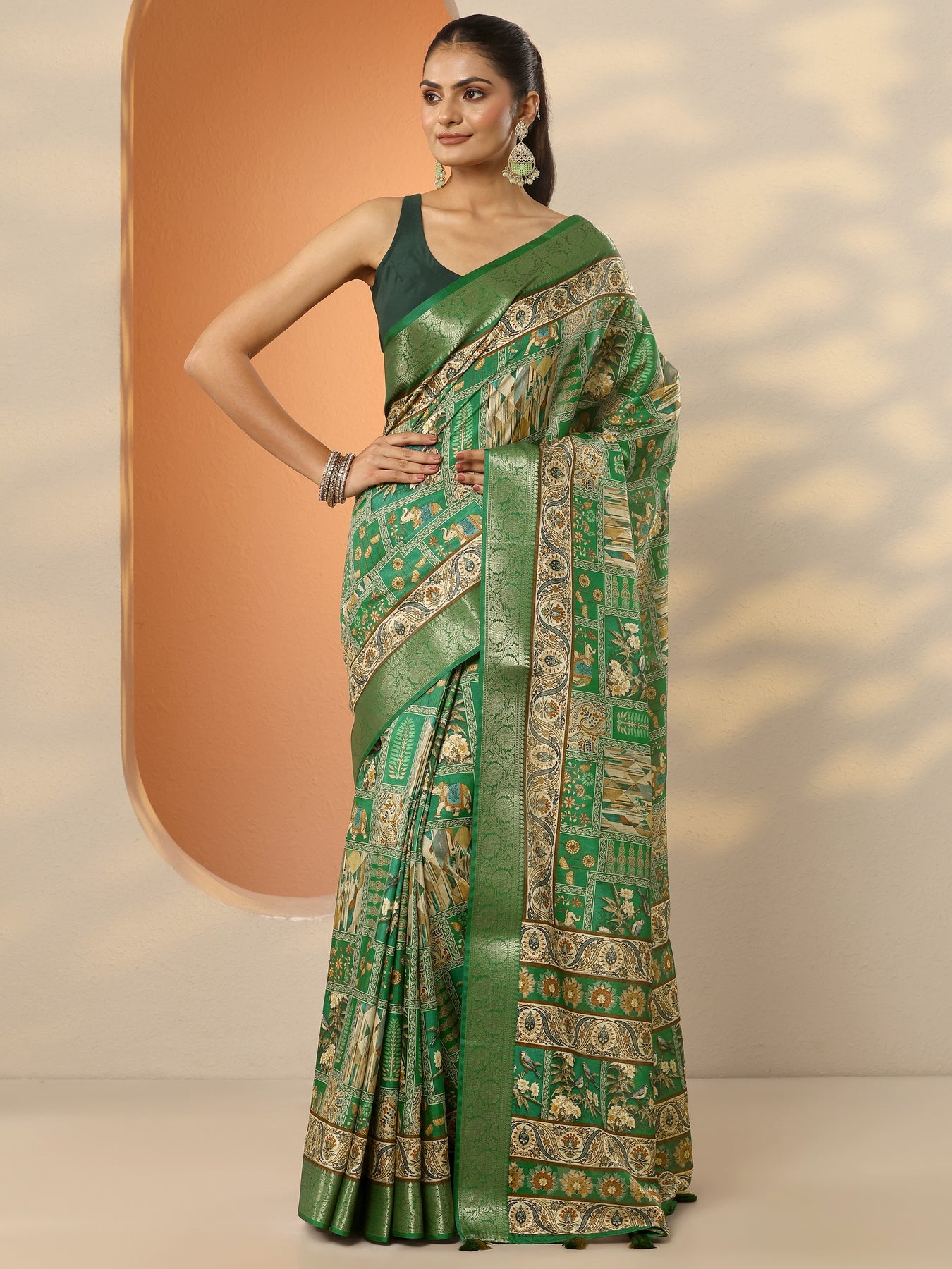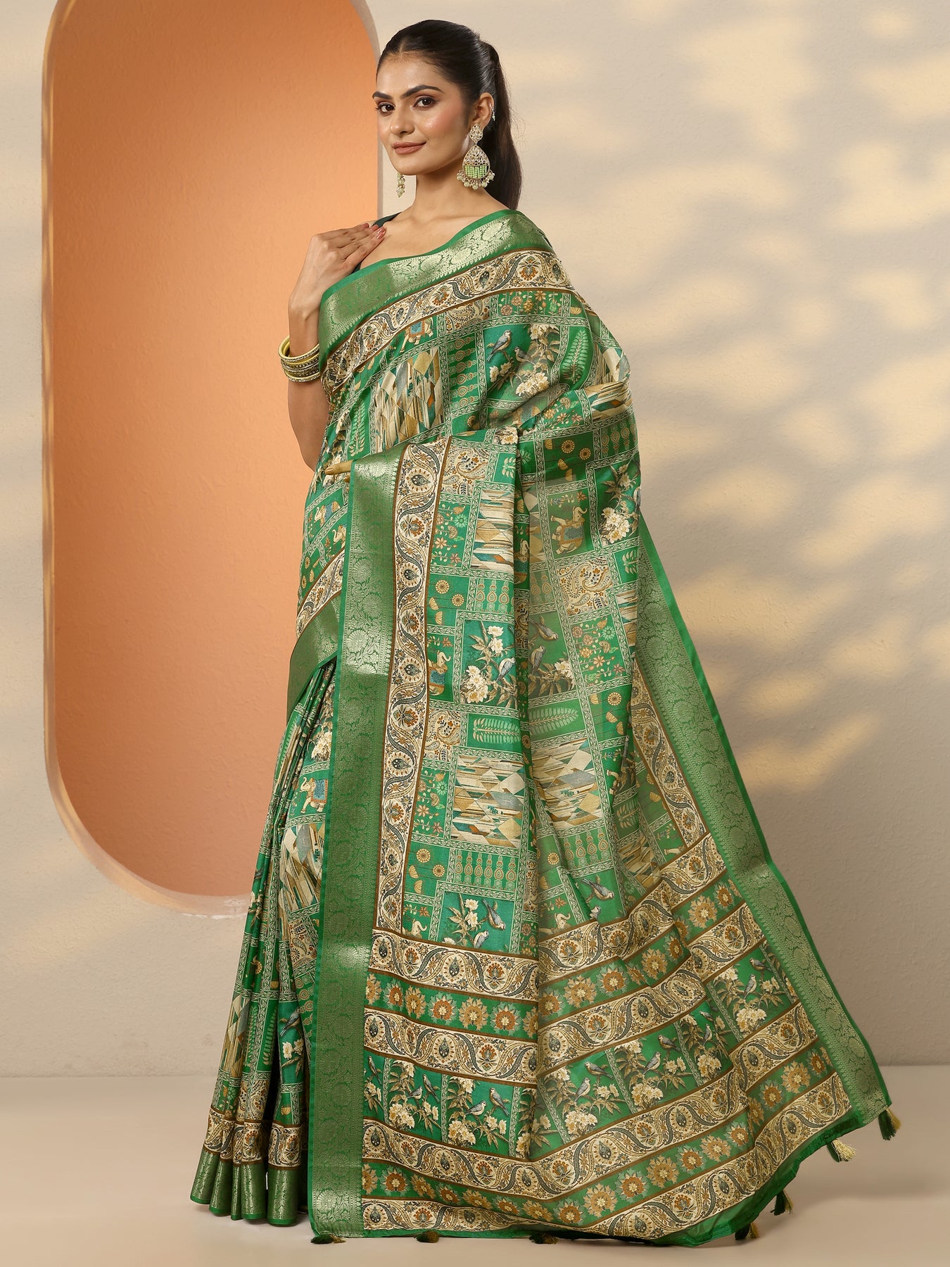 Green Printed Silk Blend Saree With Unstitched Blouse Piece