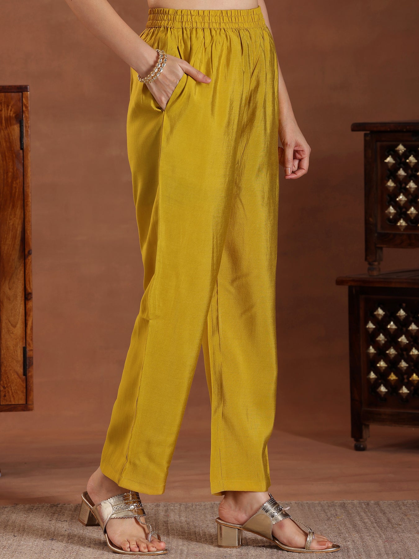 Our 3-piece mustard yellow embroidered yoke-design silk blend suit set features a straight-fit kurta with a round neckline, three-quarter sleeves, and a statement yoke. Complemented with trousers with elasticated waistband and roomy pockets, and a brocade dupatta. Adorned with sequins, thread work, and Gota Patti detailing, this charming style is perfect for festive celebrations.