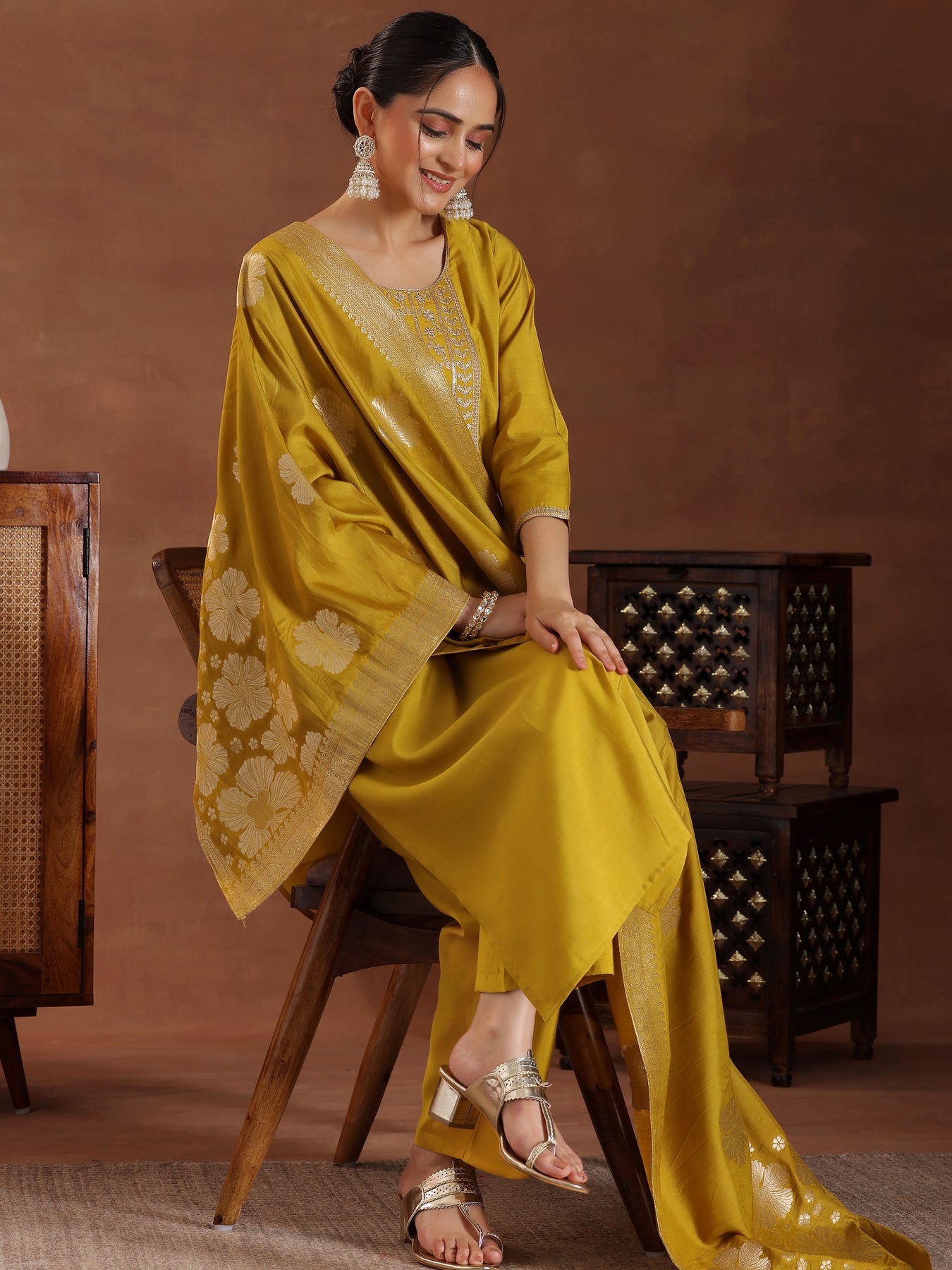 Mustard Yoke Design Silk Blend Straight Suit With Dupatta