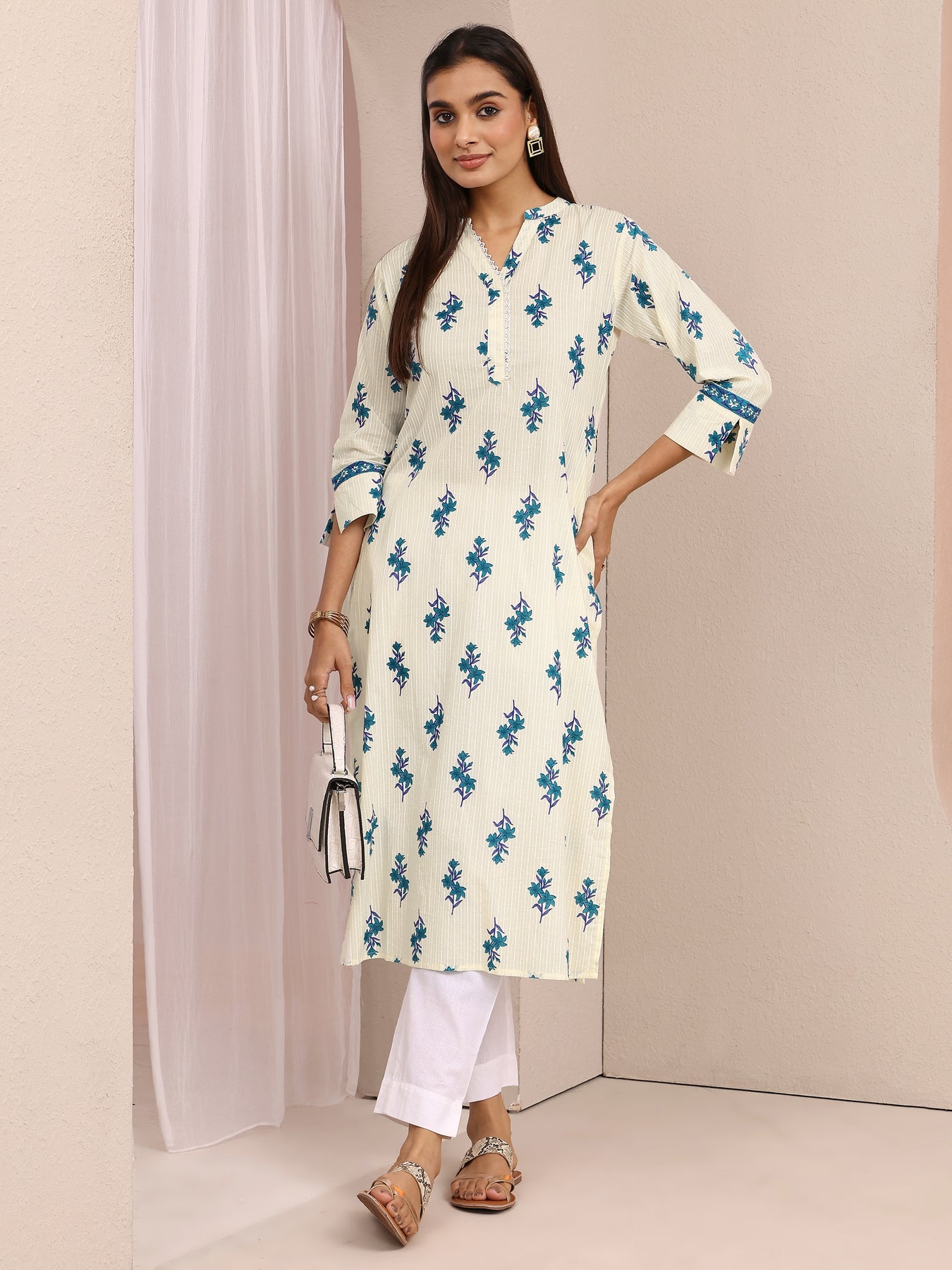 Our 1-piece off white cotton straight-fit kurta features a mandarin collar neckline, regular sleeves, and statement yoke. Adorned with floral print, this style is perfect for casual wear.