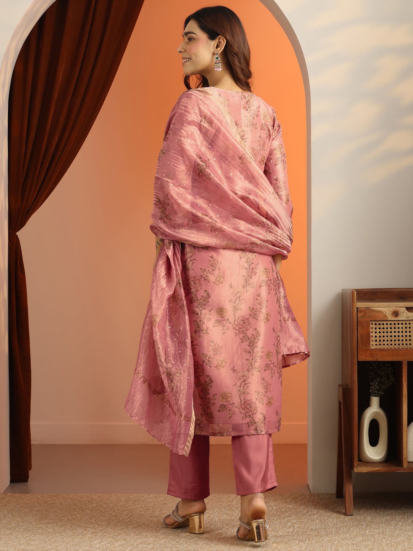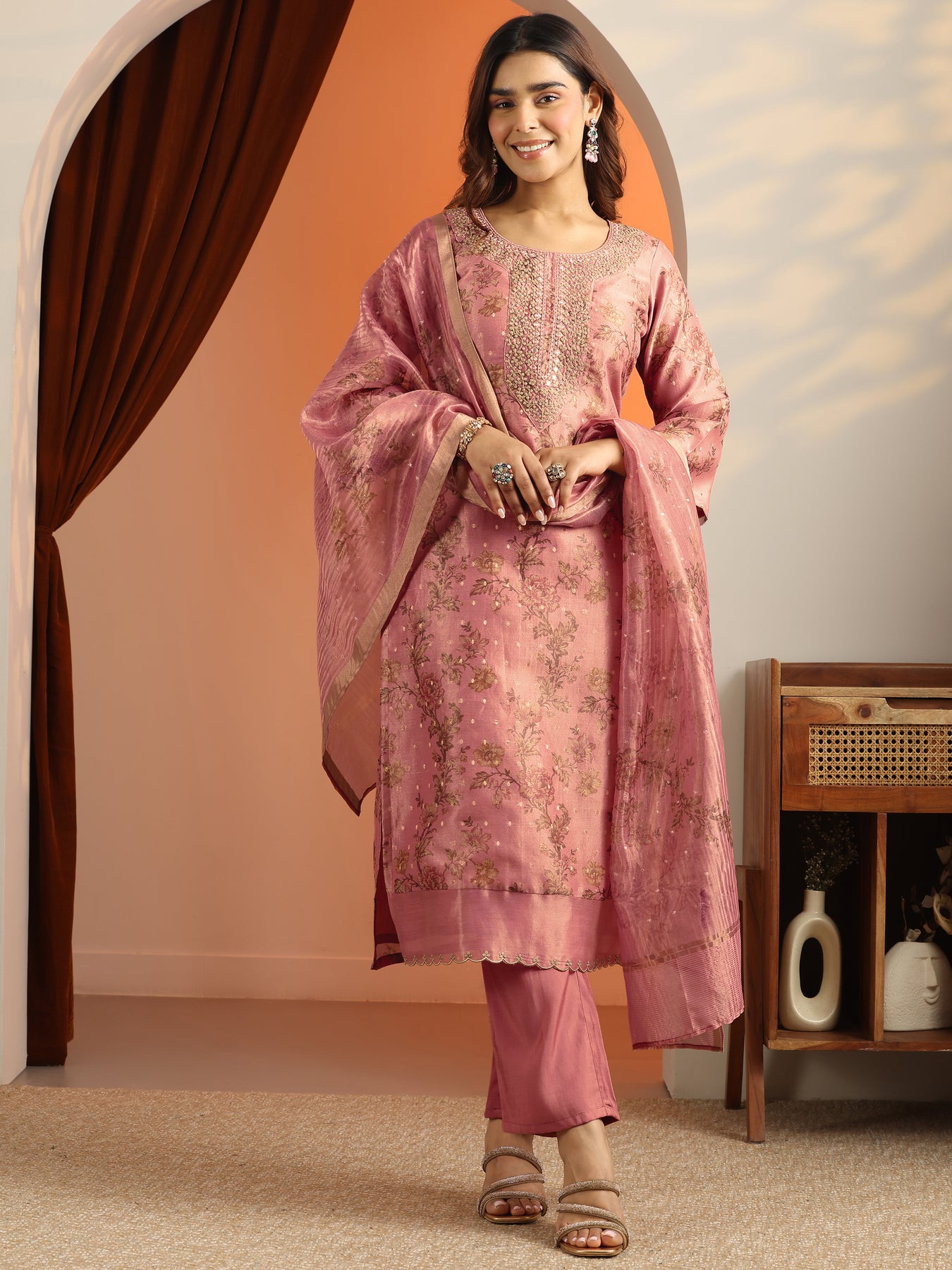 Our 3-piece Pink Silk blend Kurta Set features a Straight-fit kurta with a Round Neckline, Regular Sleeves, and statement yoke. Complemented with Straight Pants with a Partially Elasticated waistband and 2 pockets, and an Embroidered dupatta. Adorned with Floral Printed embellishments, this style is perfect for Casual wear.